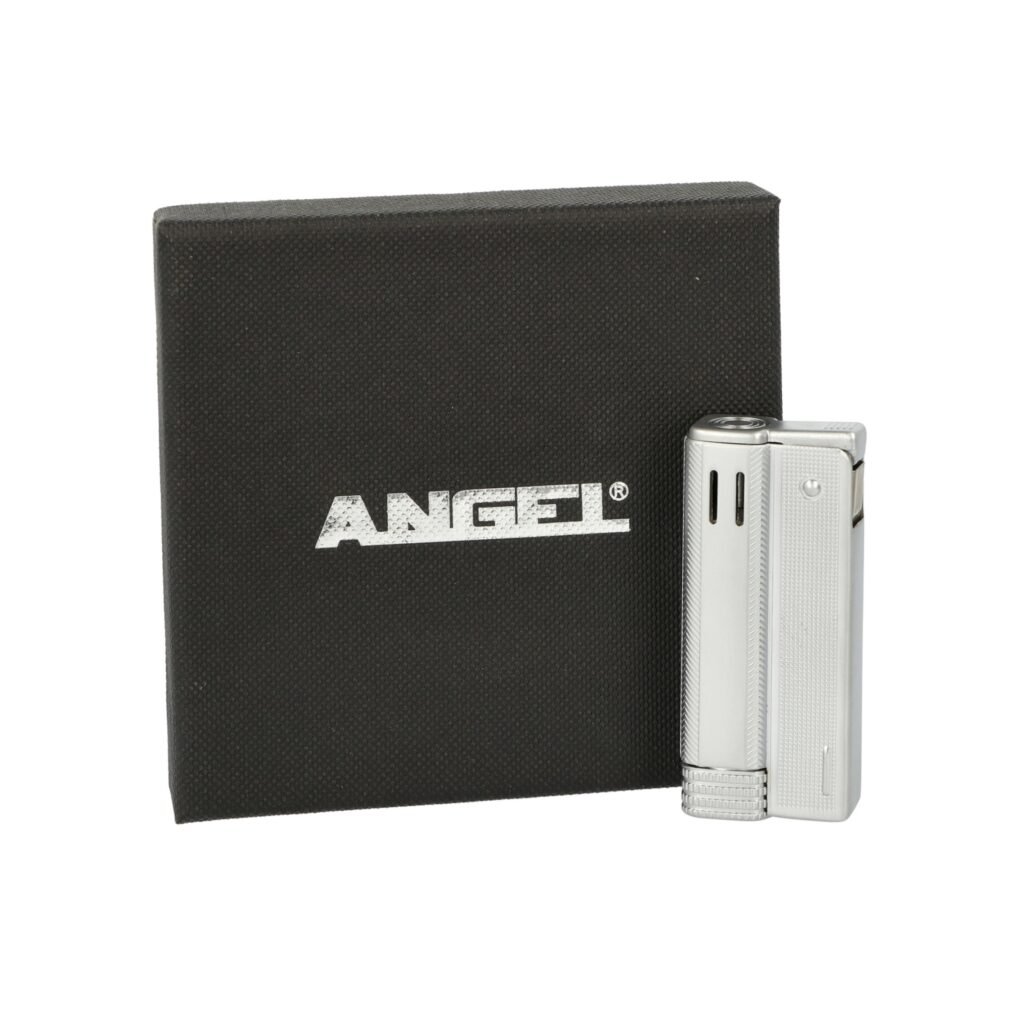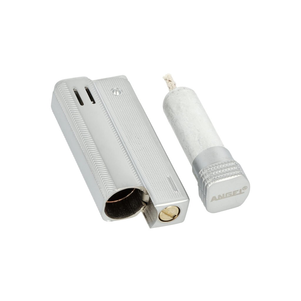 Stylový benzínový zapalovač Angel Austria Silver. Kovový kamínkový zapalovač rakušák ve stříbrném polomatném provedení a texturovaným povrchem. Stisknutím a odklopením horního krytu zapalovače škrtneme kamínkem a plamen se zapálí. Ve spodní části zapalovače najdeme vysunovací zásobník s vatou pro absorbování benzínu. Benzínový retro zapalovač je dodávaný nenaplněný v dárkové krabičce.