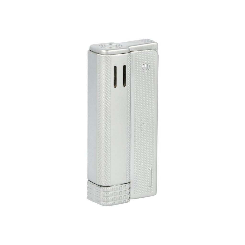 Kovový kamínkový zapalovač rakušák ve stříbrném polomatném provedení a texturovaným povrchem.