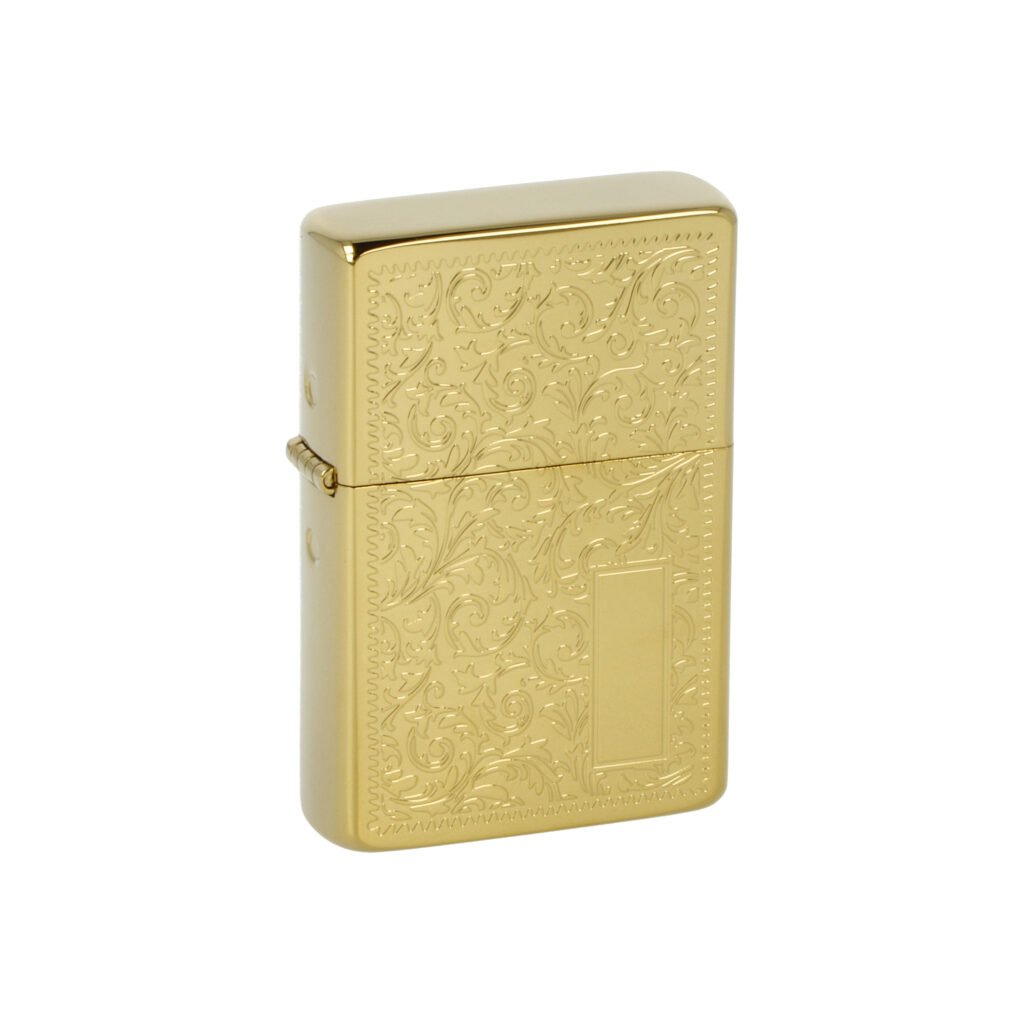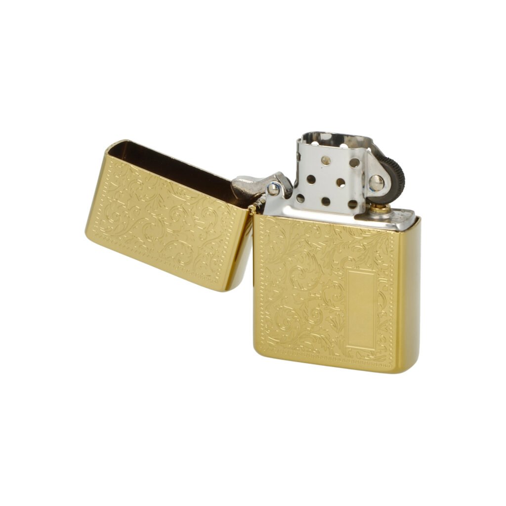 Elegantní zapalovač v leštěném zlatém provedení má přední stranu bohatě zdobenou gravírovanými ornamenty.