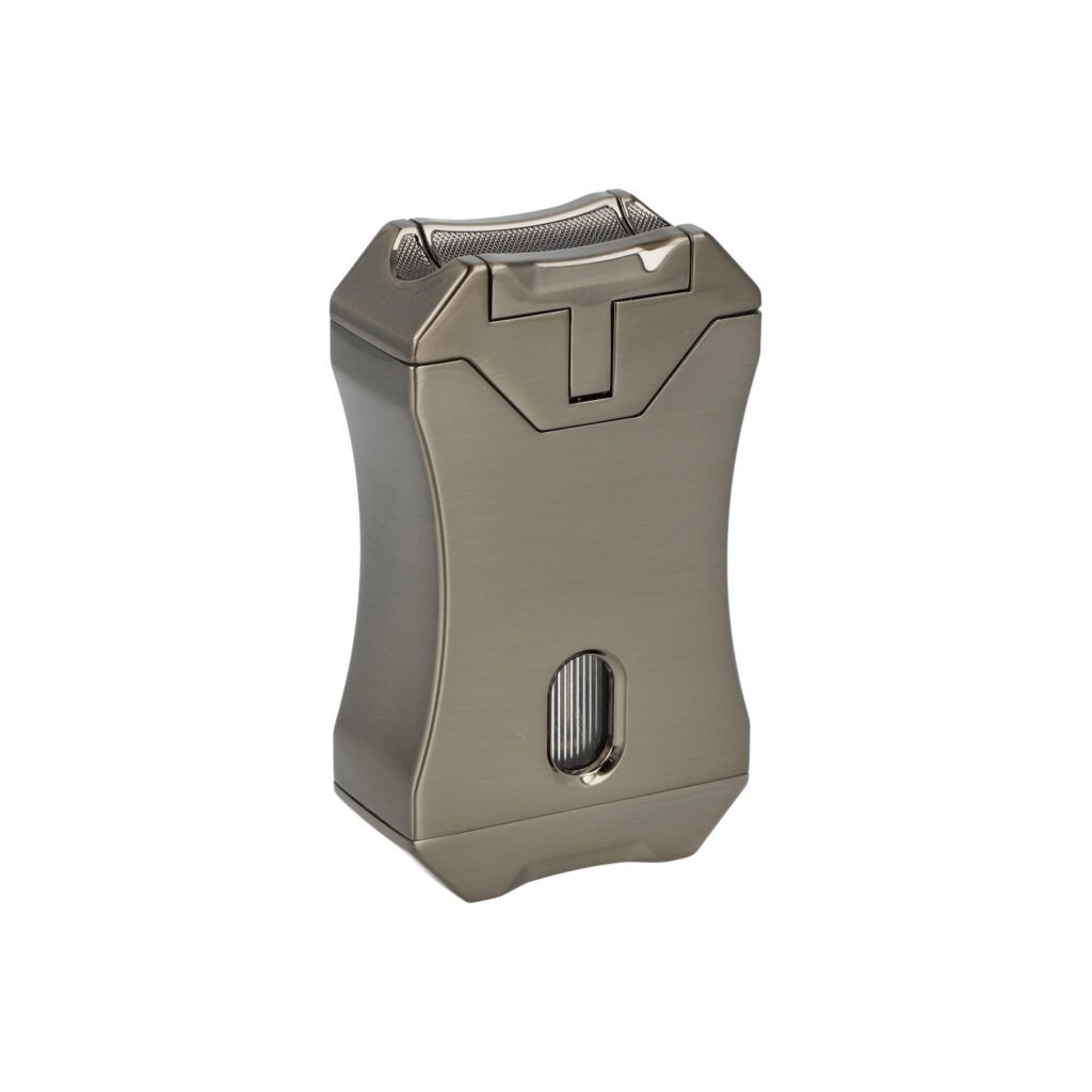 Masivní tryskový zapalovač na doutníky má povrch v lesklém gunmetalovém provedení.