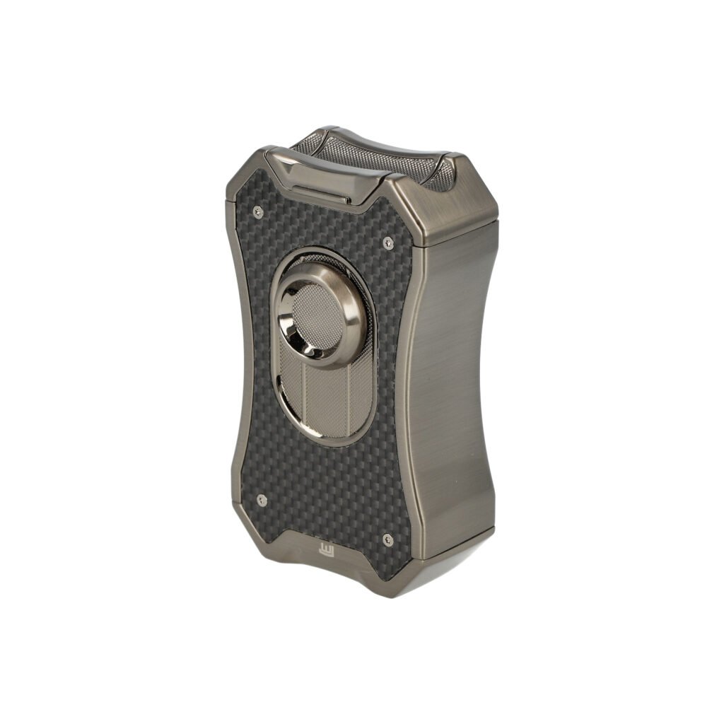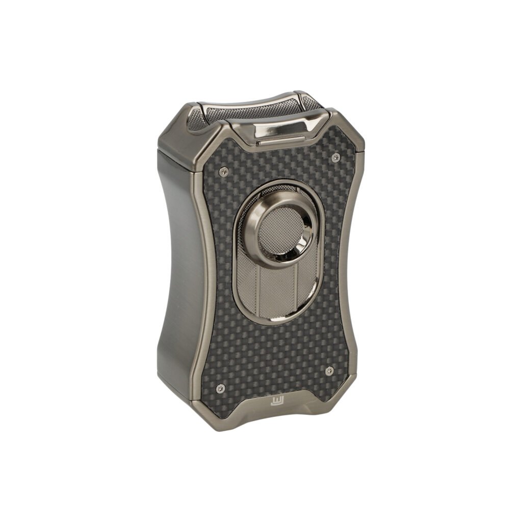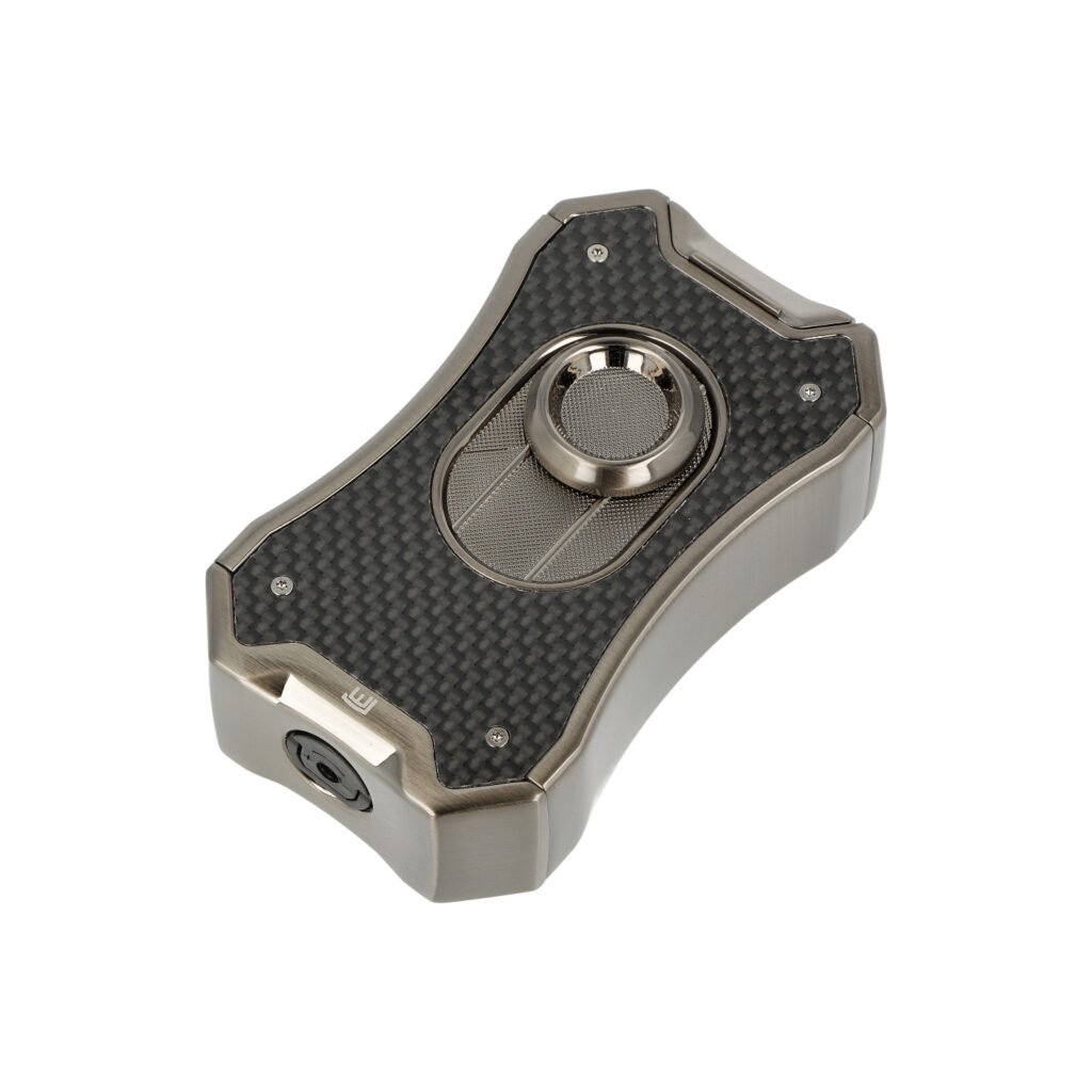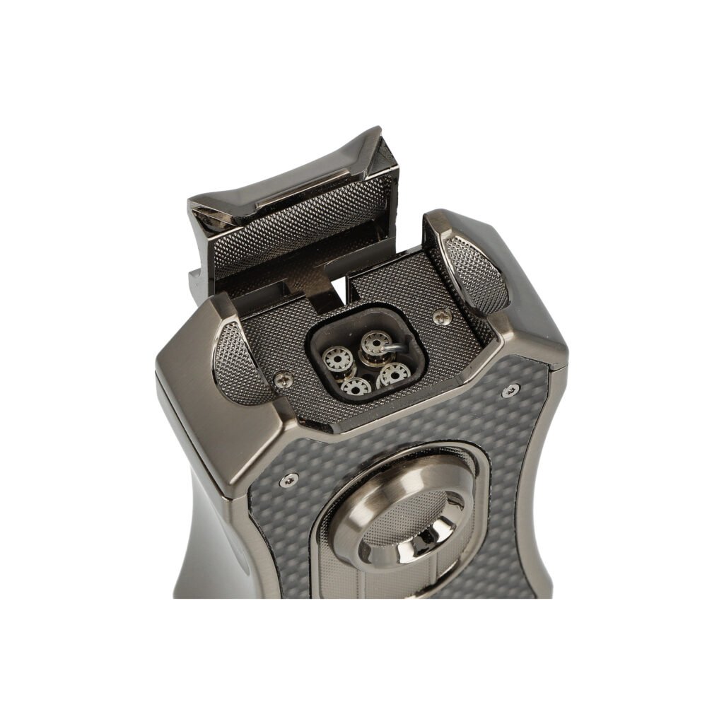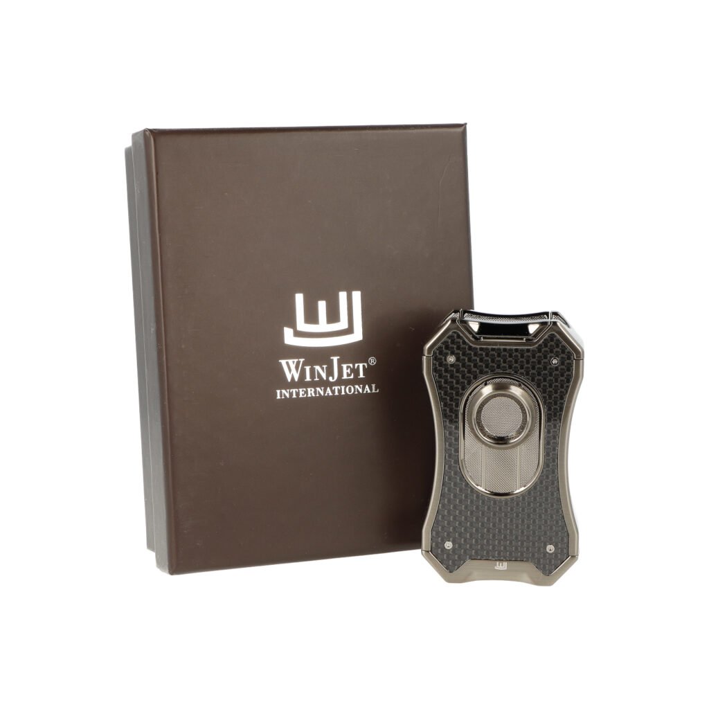 Doutníkový zapalovač Winjet Gladiator 4xJet gun real carbon. Masivní tryskový zapalovač na doutníky má povrch v lesklém gunmetalovém provedení. Přední strana je zdobená pravou karbonovou výplní. Na zadní straně najdeme okénko, díky kterému můžeme kontrolovat hladinu plynu v zapalovači. Po odklopení horního krytu a stisknutí čelního tlačítka dolů dojde k zapálení čtyřech trysek. Tyto trysky vyvinou velmi silný plamen pro zapálení Vašeho oblíbeného doutníku. Ve spodní části najdeme plynový plnící ventil a regulaci intenzity plamene.