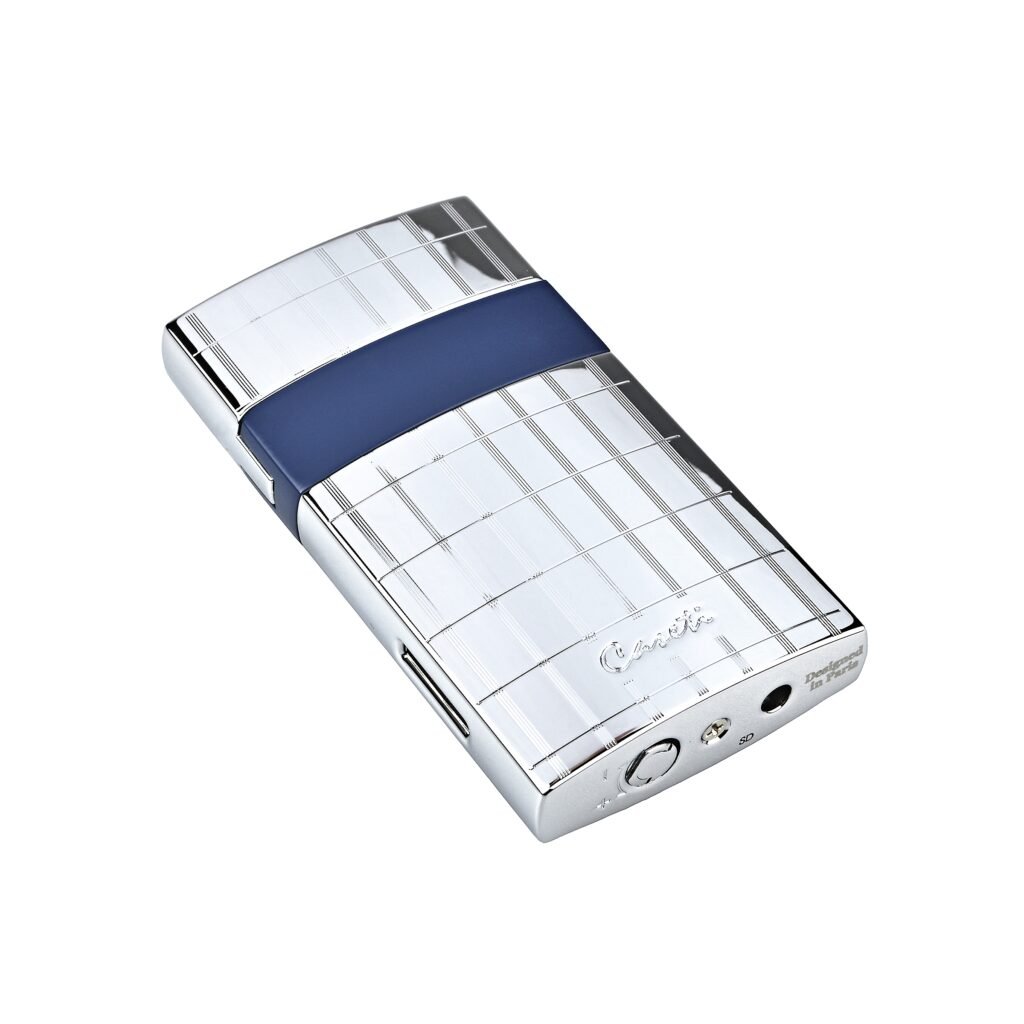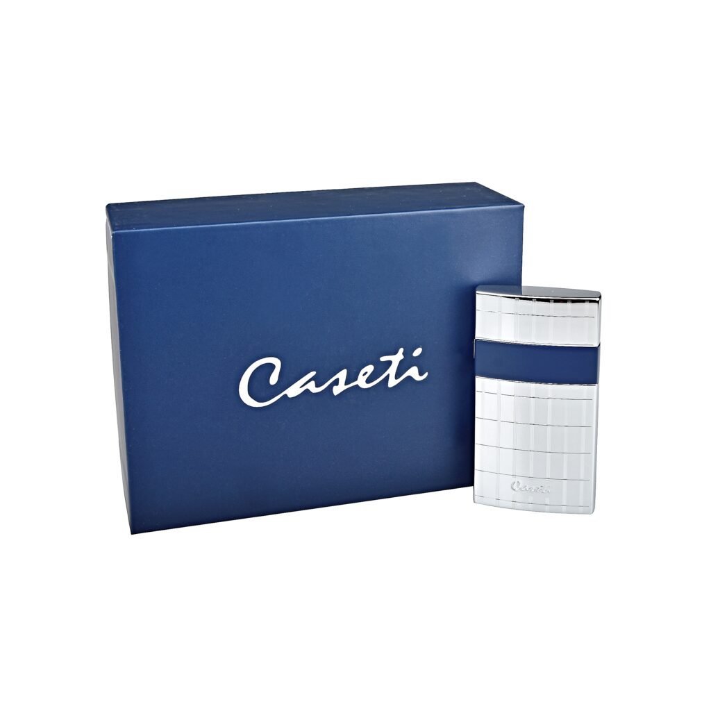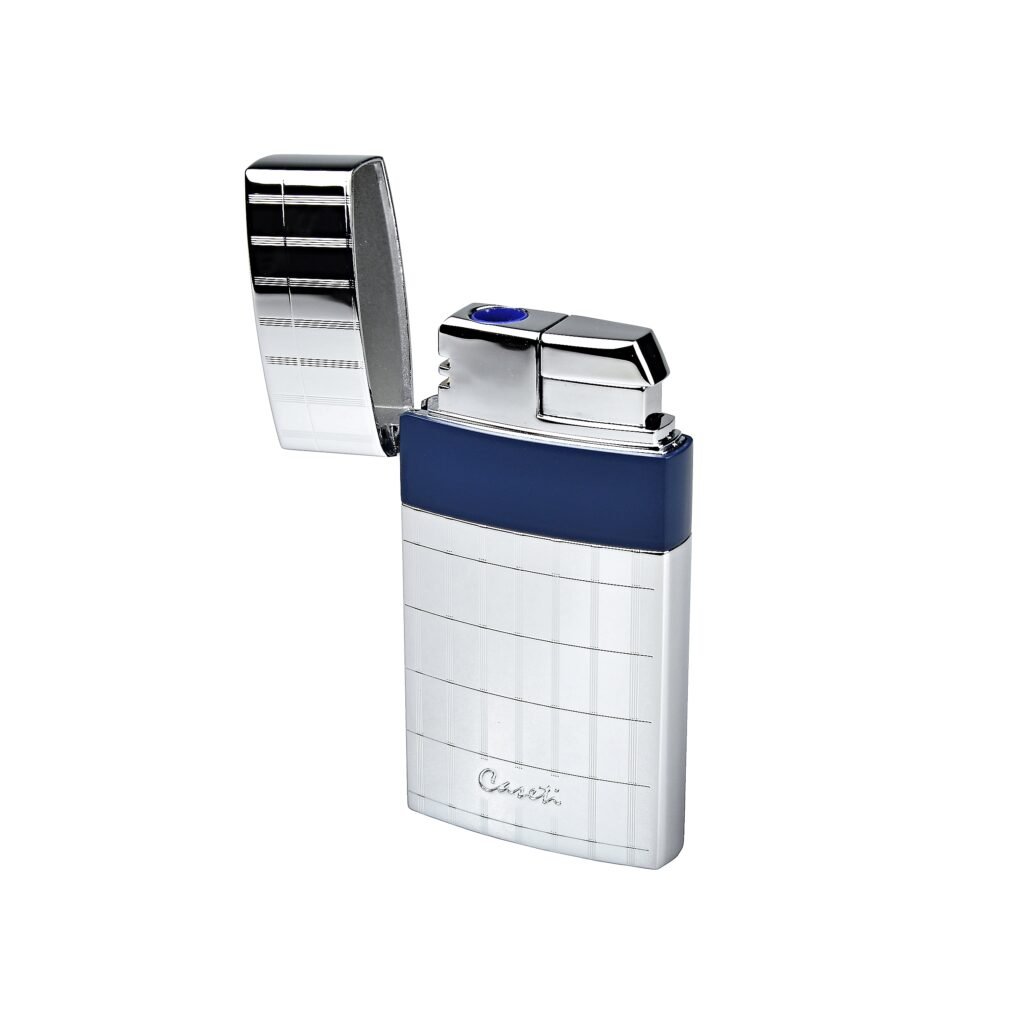 Elegantní tryskový zapalovač Caseti. Kvalitně zpracovaný kovový turbo zapalovač má povrch v lesklém chromovém provedení zdobený jemnými gravírovanými proužky a modrým pruhem po obvodu. Po odklopení horního krytu a stisknutí tlačítka se zapálí plamen. Ve spodní části zapalovače najdeme plnící ventil plynu a ovládání intenzity plamene.