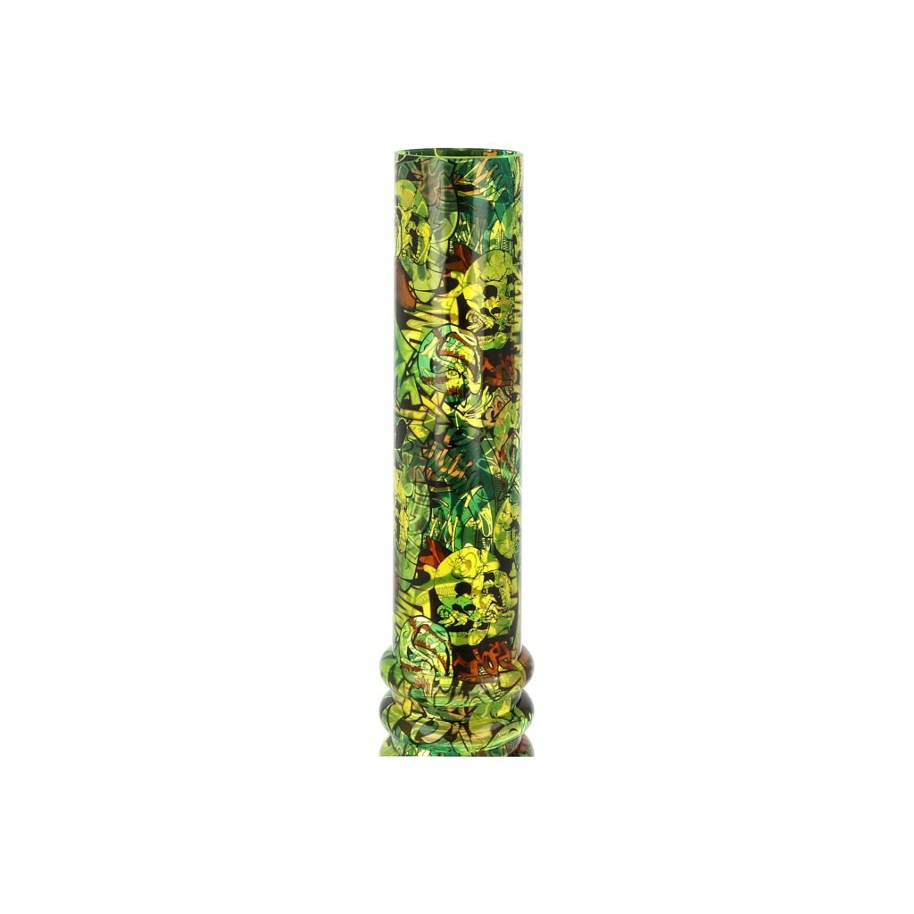 Akrylový bong Dreamliner Graffiti. Transparentní bong ve žlutém tónu má povrch barevně potištěný motivem Graffiti. Rovný akrylový bong je vyrobený z tvrzeného plastu tloušťky 2 mm. Ve spodní části najdeme otvor pro turbo. Plastový bong je vybavený kovovým dvoudílným chillumem se šroubovacím kotlíkem s kovovým drátěným sítkem.
