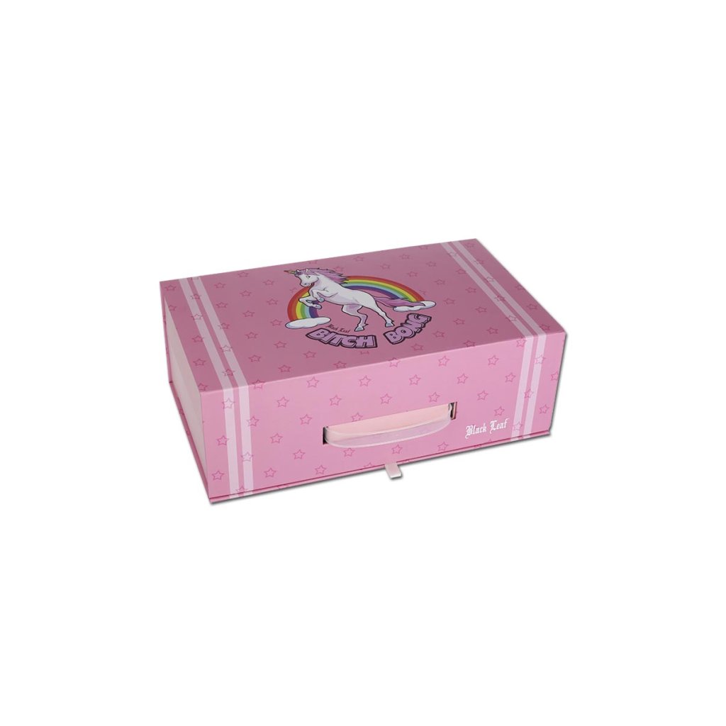 „Bitch Bong“ od Black Leaf® je opravdovým kouskem, který musíte mít. Splňuje všechny potřeby a požadavky dnešních cannababů na uspokojující vodní dýmku: praktická velikost, průměr vhodný pro plíce, technologie chlazení kouře, jako je sání páry s difuzorovými štěrbinami, 4-ramenný perkolátor a 3-pinový lapač ledu. K tomu miska na bylinky s uspokojivou nosností a velmi okouzlující design s jednorožcem a malými hvězdičkami - perfektní!