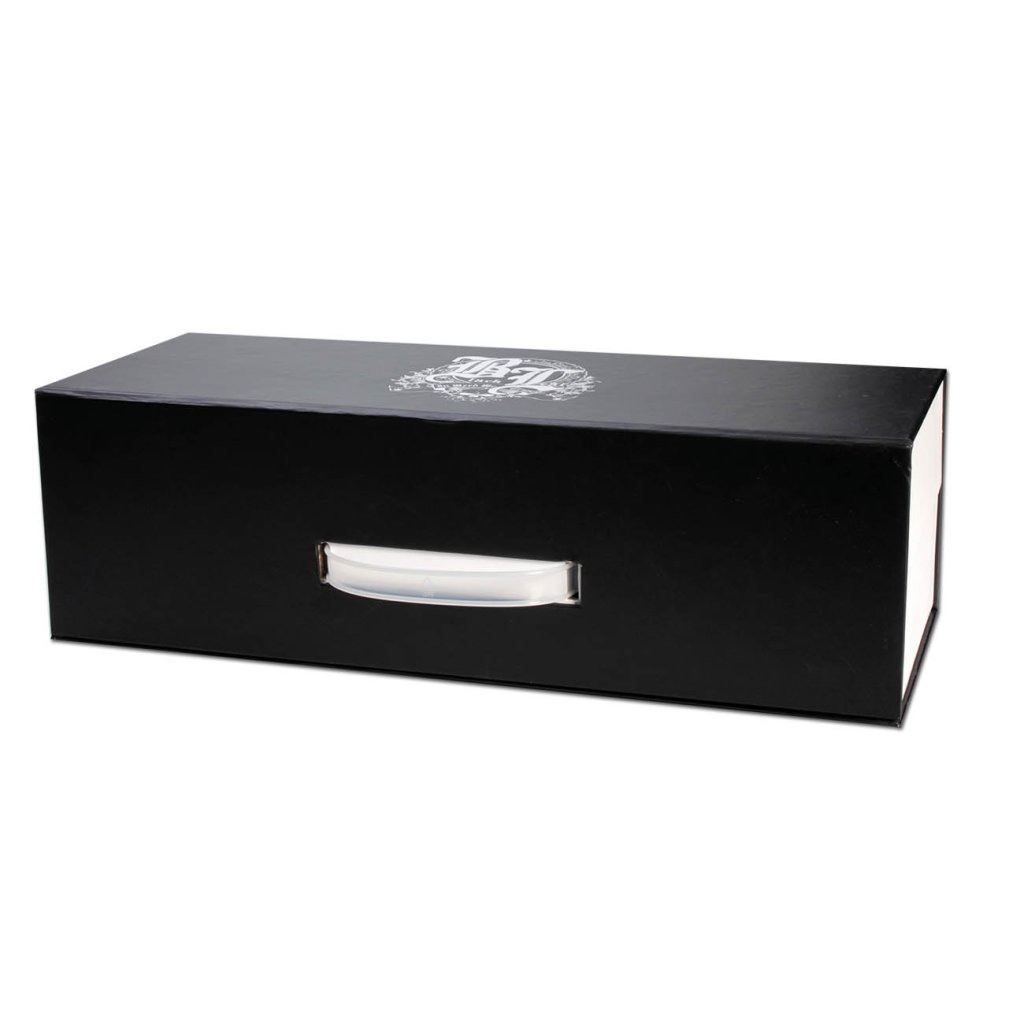Bong je uložen v černobílé krabičce o rozměrech 430 x 170 x 132 mm a je ideální jako dárek nebo na cesty. Je vybaven 6ramenným percolárorem s ochranou proti stříkající vodě, bočním výkopem s pryžovou zátkou, adaptérem se štěrbinami difuzoru, miskou na bylinky s SG 14,5 mm s rollstopem a olejovou miskou s SG 14,5 mm.