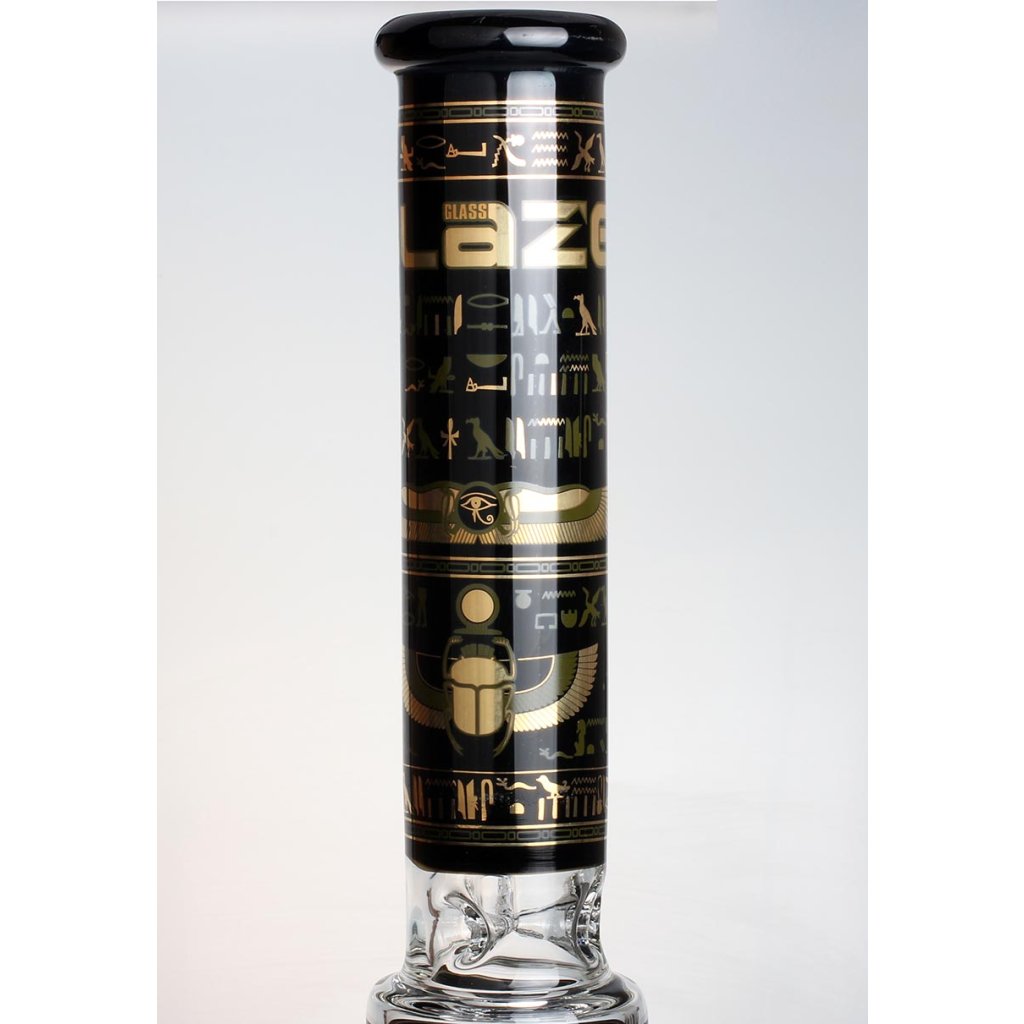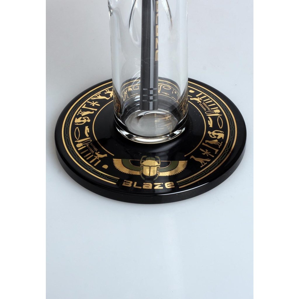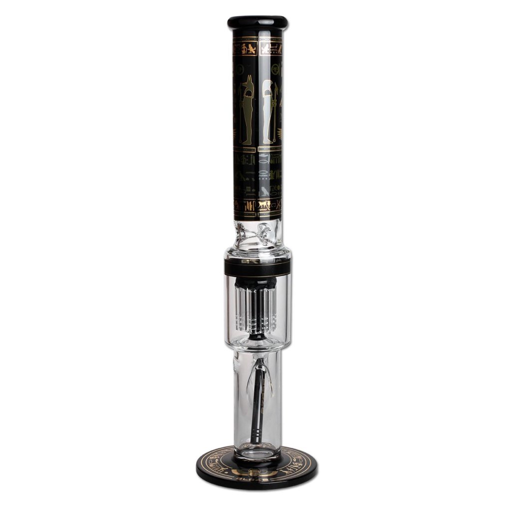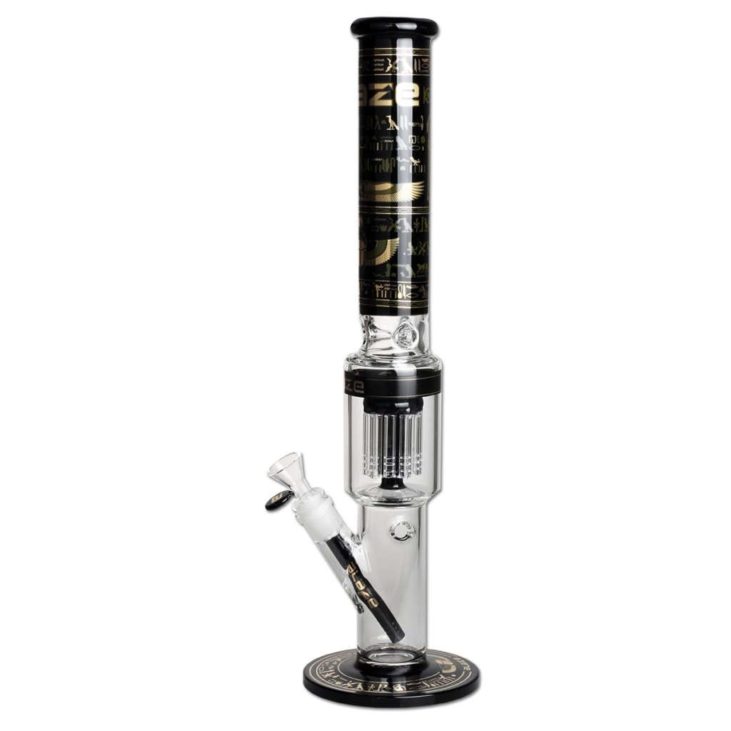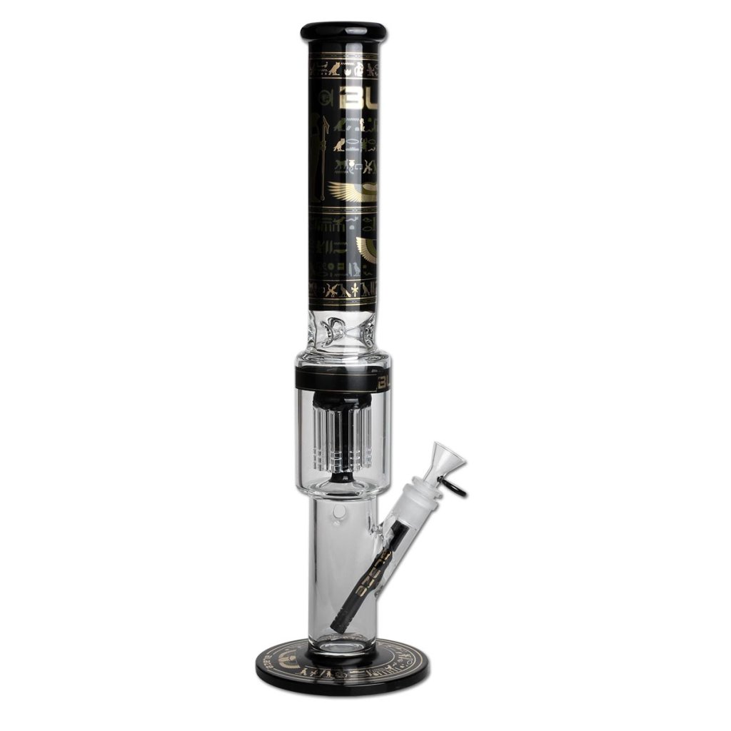 Stylový a výkonný bong z dílny BLAZE GLASS®, inspirovaný egyptskými motivy. O výrazné ochlazení a filtraci se stará 10-ramenný stromový perkolátor, který dým rozbíjí do malých bublinek. Tyto víry ve vodě snižují teplotu a zjemňují každé potáhnutí.