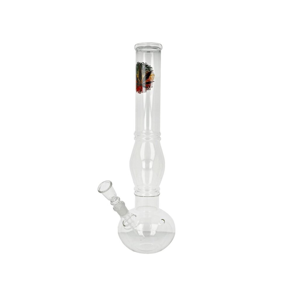 Transparentní bong Rainbow Leaf. Tvarovaný bong s barevným listem konopí je ukončený středně silným hrdlem. Otvor pro turbo najdeme ve spodní části bongu. Oproti standardním bongům je tento prémiový bong vyrobený z tepelně odolného borosilikátového skla tloušťky 2,5 mm. Jednodílný chillum bongu je ukončený nalisovaným kotlíkem s otvorem cca 4 mm.