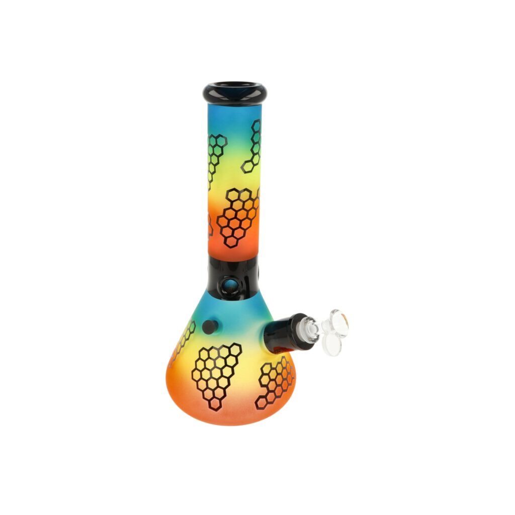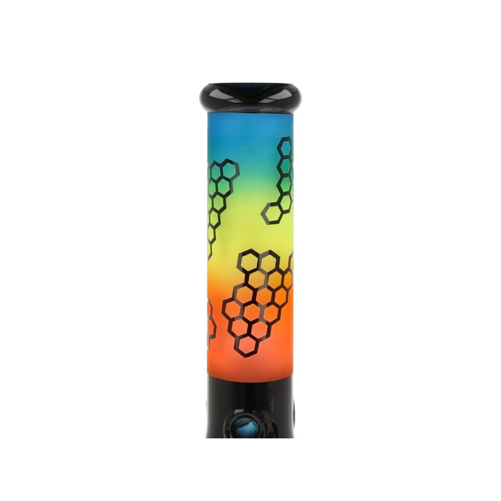 Skleněný bong Super Heroes Beaker Rainbow Colors. Atraktivní bong tvaru Beaker s povrchem v barevných přechodech je zdobený černými lesklými prvky.