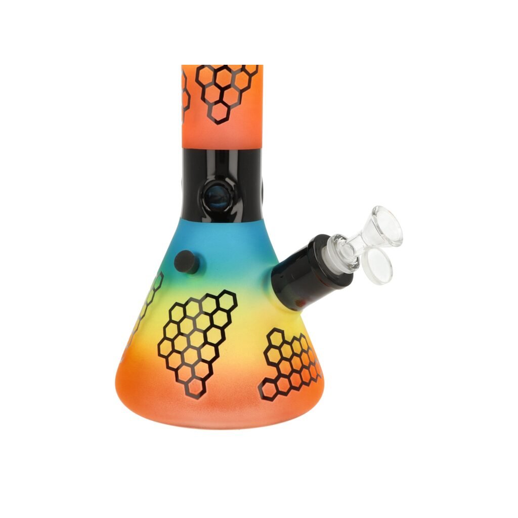 Skleněný bong Super Heroes Beaker Rainbow Colors. Atraktivní bong tvaru Beaker s povrchem v barevných přechodech je zdobený černými lesklými prvky. Ice bong ukončený silným hrdlem je vybavený "výstupky" pro udržení kostek ledu k ochlazení kouře. Oproti standardním bongům je tento prémiový bong vyrobený z tepelně odolného borosilikátového skla tloušťky 7 mm. Ve spodní části najdeme otvor pro turbo s gumovou záslepkou. Dvoudílný chillum bongu s difuzérem se šesti zářezy, který pomáhá zjemnit a ochladit kouř již na začátku, je ukončený samostatným kotlíkem s praktickým držátkem a větším otvorem (cca 7 mm).