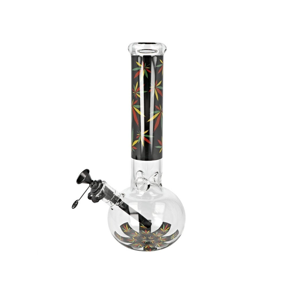 Skleněný bong Super Heroes Transparent Weed. Bong ve tvaru laboratorní baňky v černém tónu zdobený barevnými listy konopí je ukončený silným hrdlem.