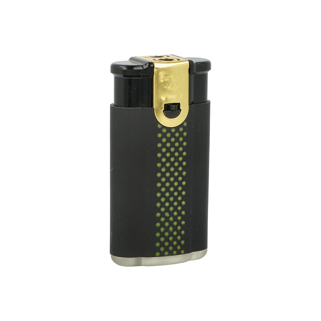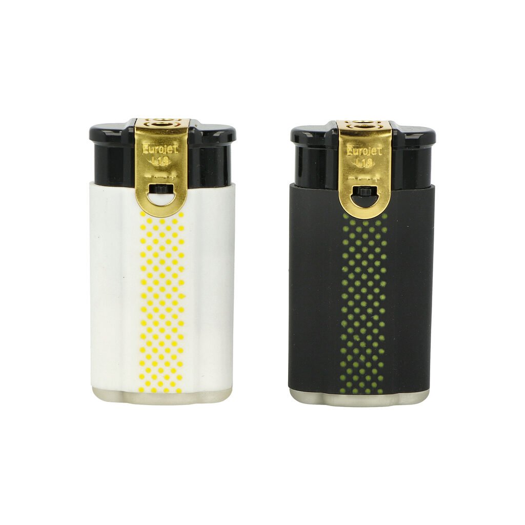 Plynový zapalovač Eurojet Duoflame B&W s kombinací normálního a turbo plamene. Zapalovač je plnitelný. Výška zapalovače 6,5cm.