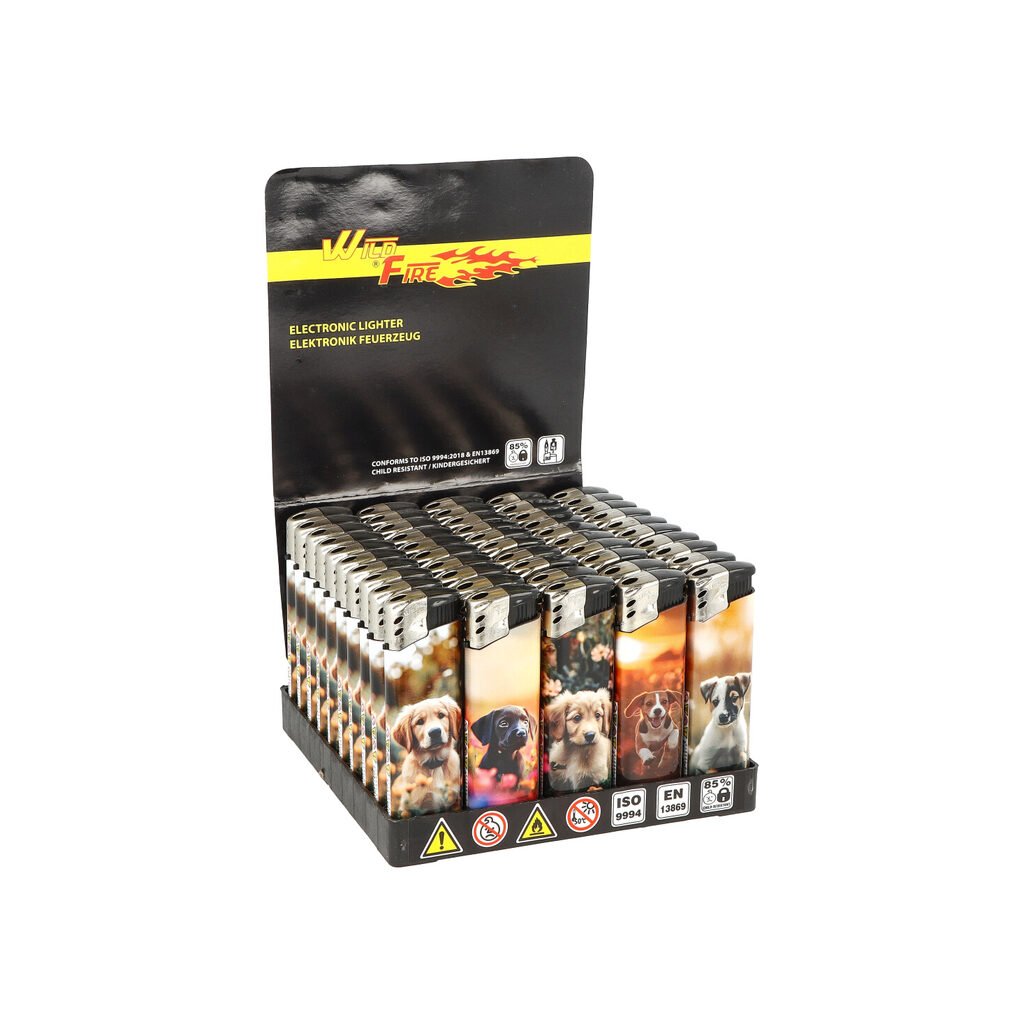 Plynový zapalovač Wildfire. Plnitelný zapalovač s možností nastavení výšky plamene. Prodej pouze po celém balení (displej) 50 ks. Výška zapalovače 8 cm.