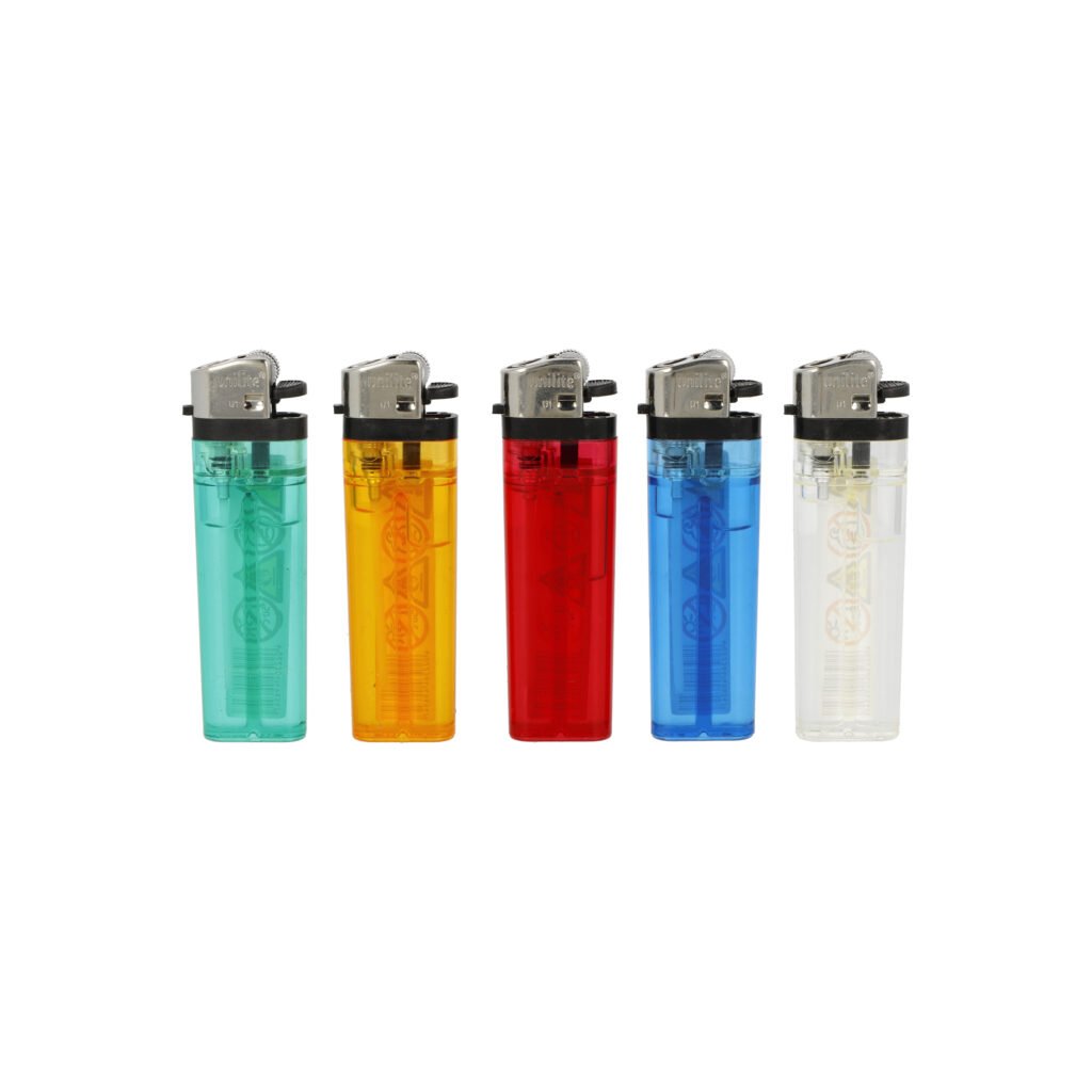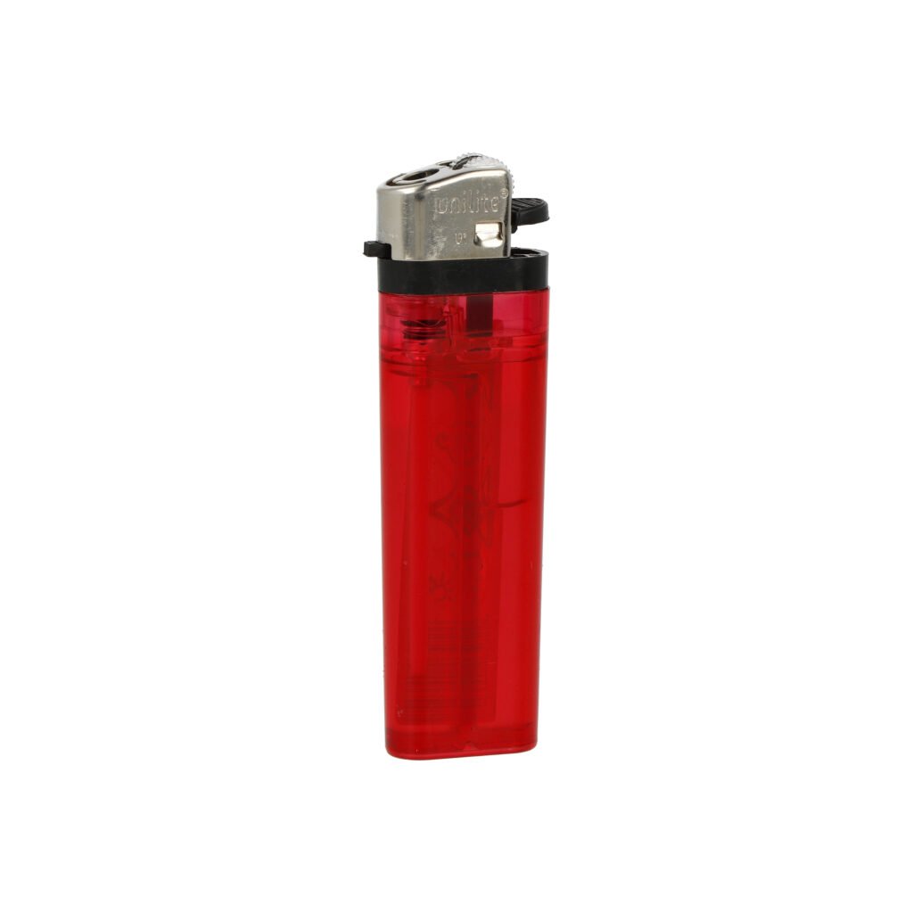 Plynový jednorázový zapalovač Unilite. Transparentní kamínkový zapalovač s regulací intenzity plamene není plnitelný. Výška zapalovače 8 cm.