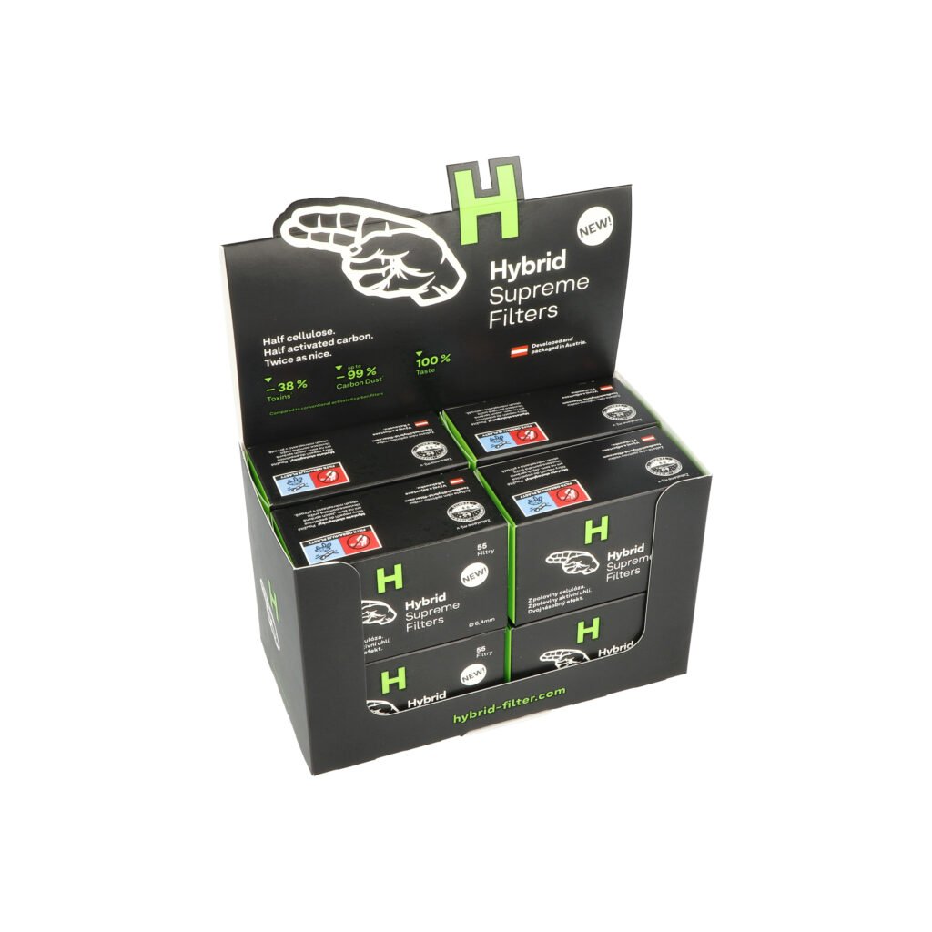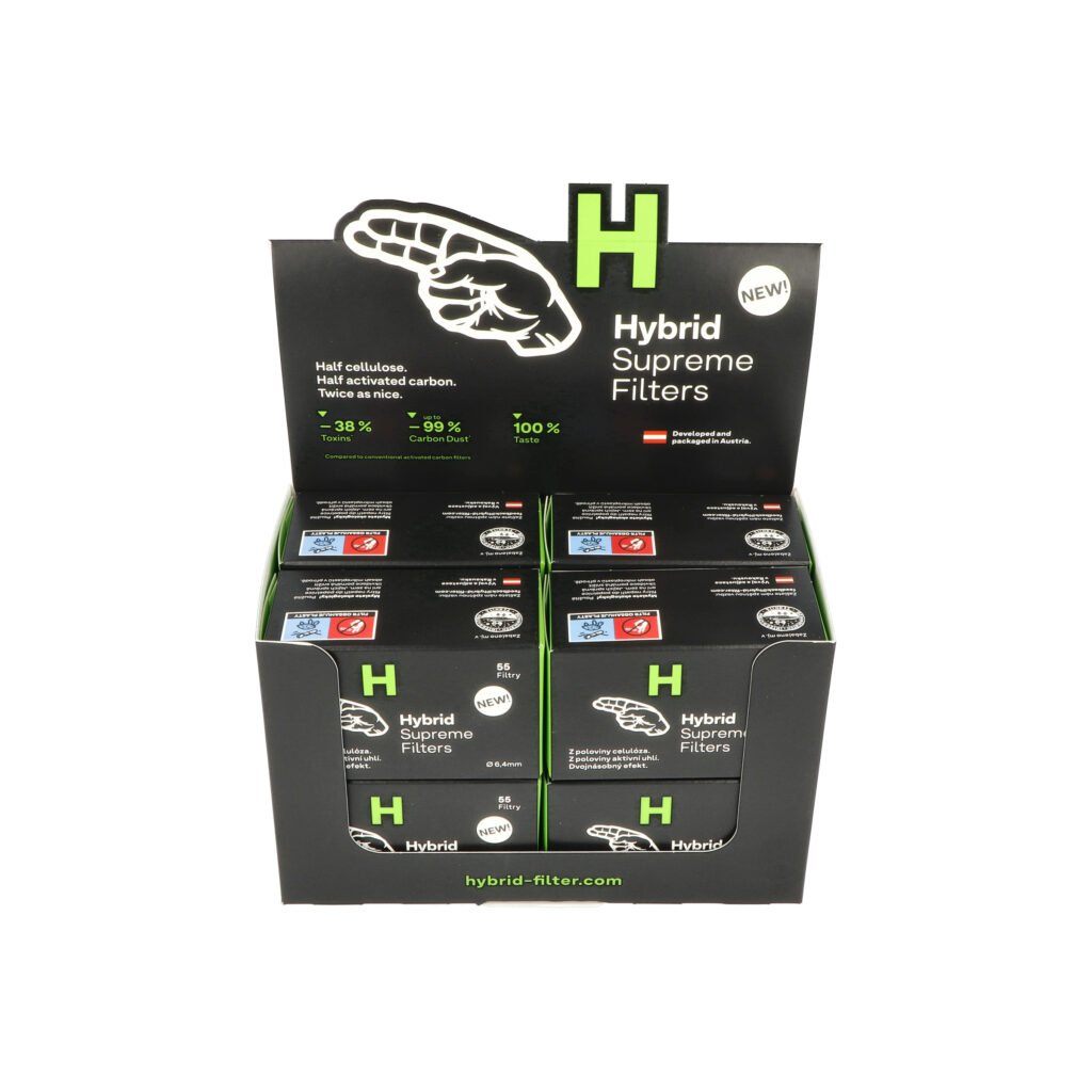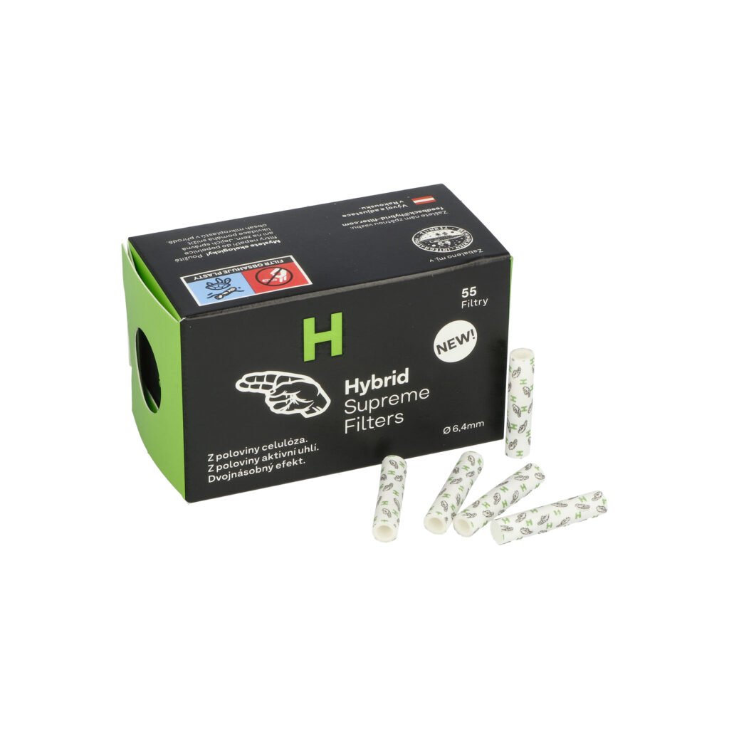 Unikátní cigaretové filtry Hybrid Supreme Filters s aktivním uhlím. Perfektní filtr není z celulózy. A není ani z aktivního uhlí. Obsahuje obě tyto složky. Unikátní kombinace složek ve filtru Hybrid Supreme pohlcuje značnou část škodlivin obsažených v kouři. Zůstává jenom decentní požitek z kouření a bylinná příchuť. Vědecky testované filtry mají následující účinky: o 38% méně škodlivin, o 16% méně nikotinu, až o 99% méně jemného prachu z aktivního uhlí a zachovávají 100% chuť.