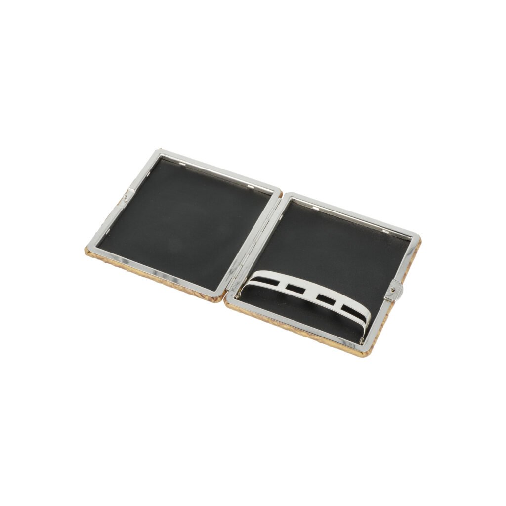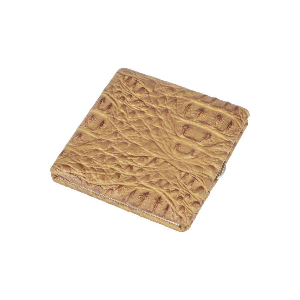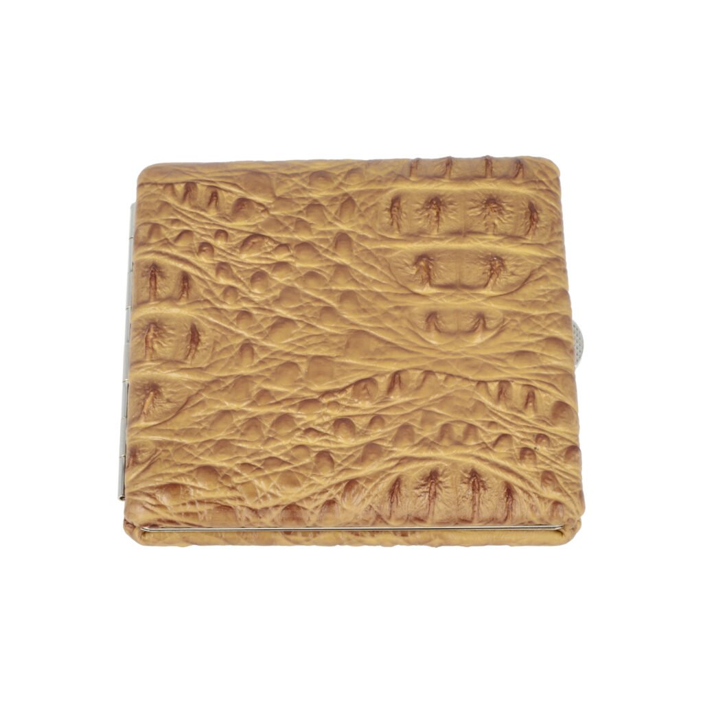 Elegantní koženková tabatěrka na 10 ks cigaret klasické velikosti (King Size). Kovové cigaretové pouzdro Angelo Croco je ve světle hnědém pololesklém provedení s hrubší texturou na povrchu. Cigarety jsou uvnitř tabatěrky zajištěné pružinovým kovovým mechanismem, který zamezí pochybu cigaret a zabrání tím jejich poškození. Mechanismus a obvodový rámeček tabatěrky je v lesklém chromu. Přední a zadní strana pouzdra je stejná. Cigaretové pouzdro je dodávané v kartonové krabičce.