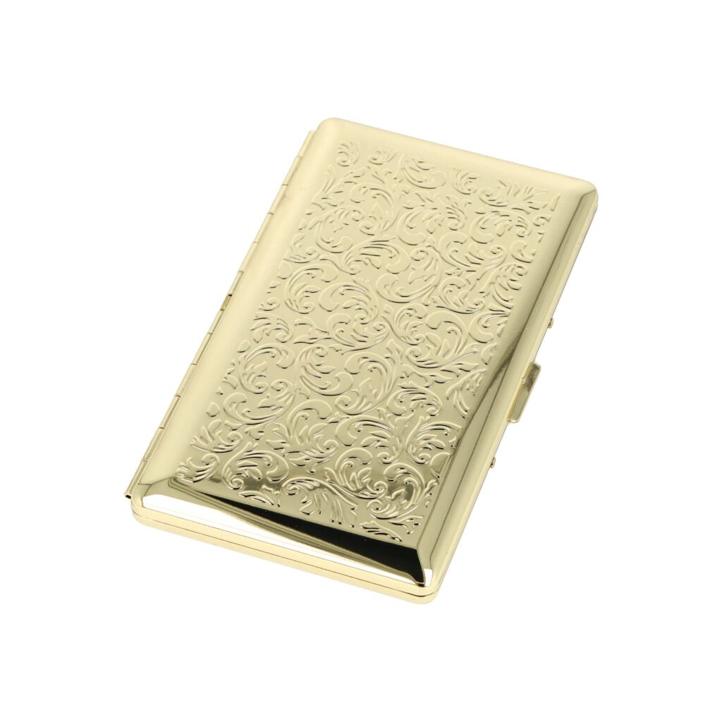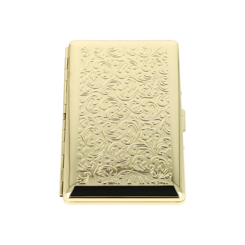 Kovová dámská tabatěrka se zrcátkem na slim cigarety. Atraktivní cigaretové pouzdro Brass v leštěném mosazném provedení pojme 10 ks slim cigaret o průměru 6 mm. Po otevření pouzdra najdete na pravé straně prostor pro cigarety, na levé praktické zrcátko. Stejná přední a zadní strana je zdobená ornamenty, které vystupují nad povrch. Cigarety v pouzdru jsou zajištěny plíškem. Cigaretové pouzdro je dodávané v kartonové krabičce.