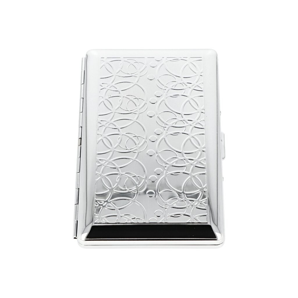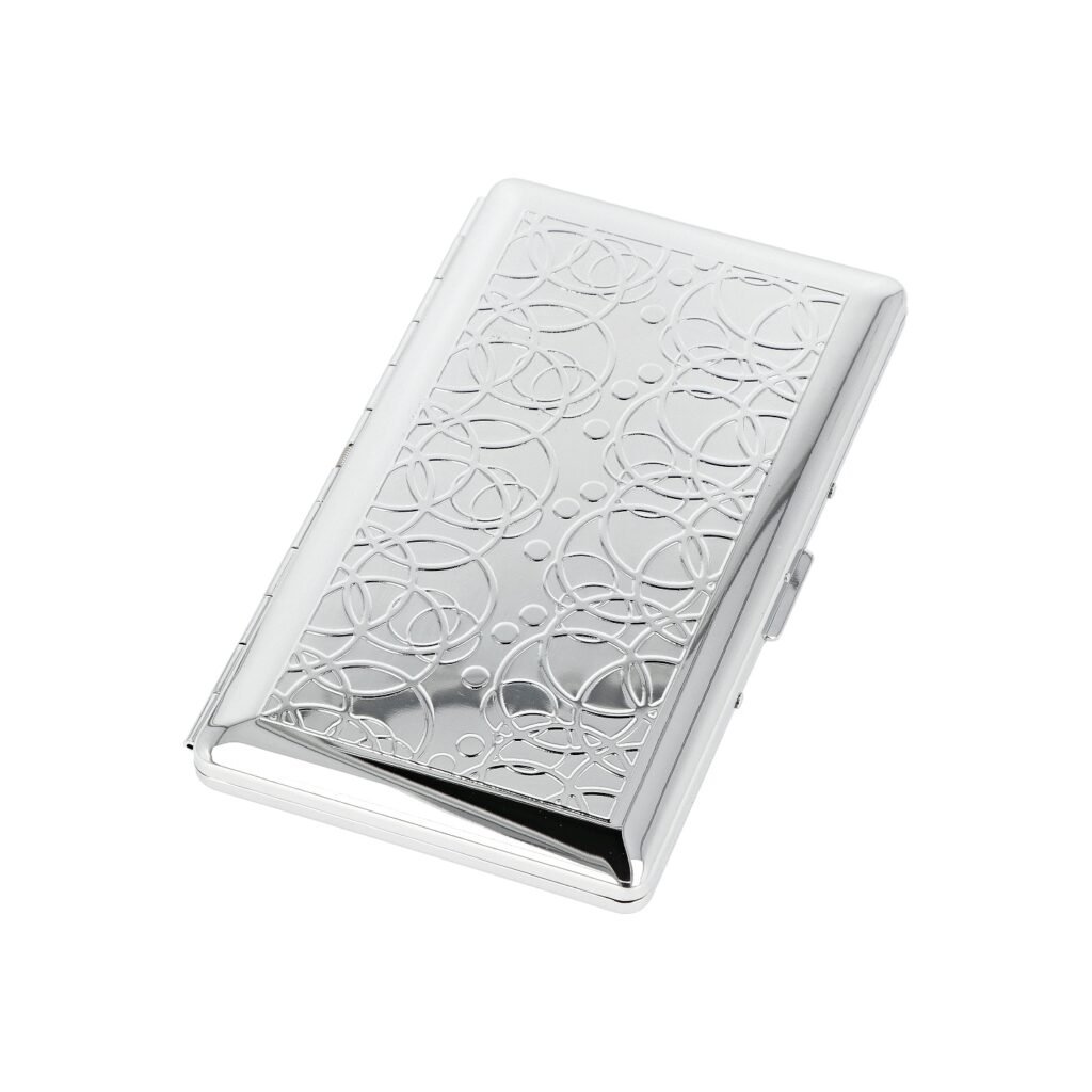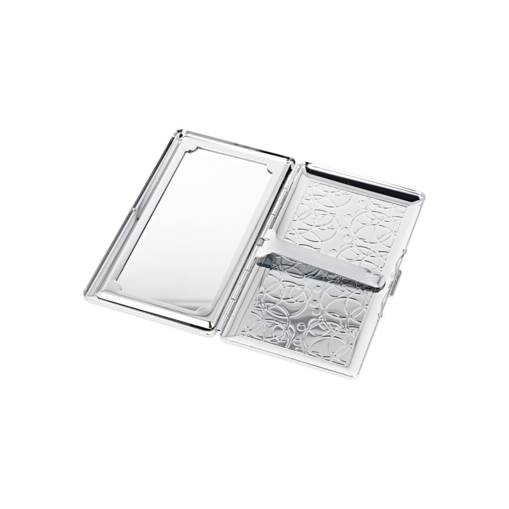 Elegantní dámská tabatěrka se zrcátkem na slim cigarety. Kovové cigaretové pouzdro Chrome s povrchem v leštěném chromovém provedení pojme 10 ks slim cigaret o průměru 6 mm. Po otevření pouzdra najdete na pravé straně prostor pro cigarety, na levé praktické zrcátko. Stejná přední a zadní strana je zdobená ornamenty, které vystupují nad povrch. Cigarety v pouzdru jsou zajištěny plíškem. Cigaretové pouzdro je dodávané v kartonové krabičce.