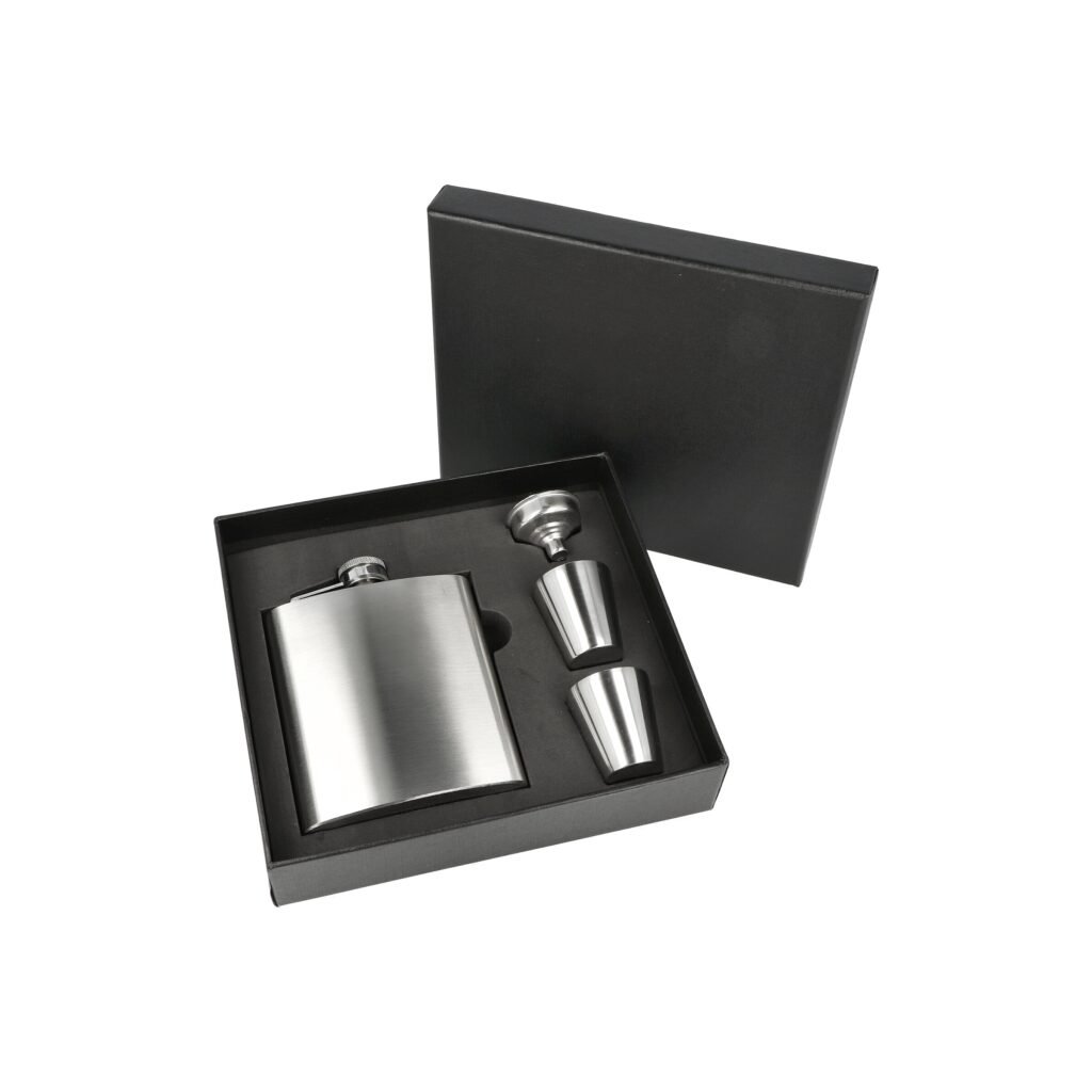 Dárková sada nerezová placatka na alkohol (likérka) s pohárky. Povrch placatky a pohárků je v jemně broušeném provedení. Likérka klasického prohnutého tvaru je vybavená šroubovacím uzávěrem a držákem víčka, který zabrání jeho ztrátě. Obsah sady: likérka, 2 pohárky, nálevka. Sada je dodávaná v dárkovém boxu.