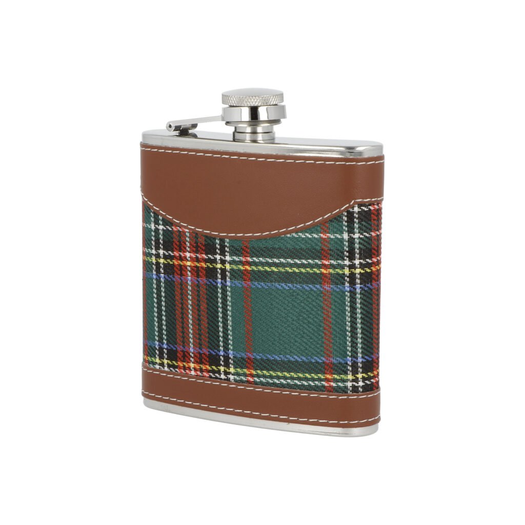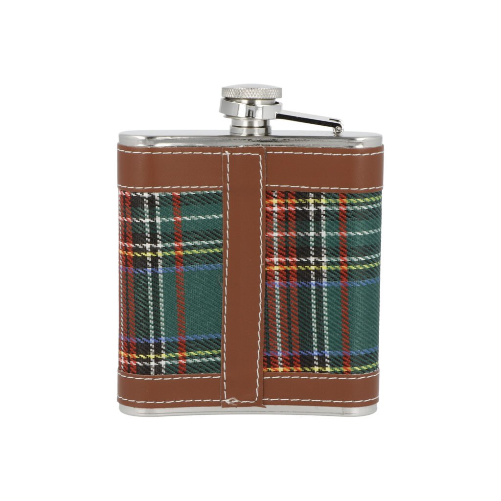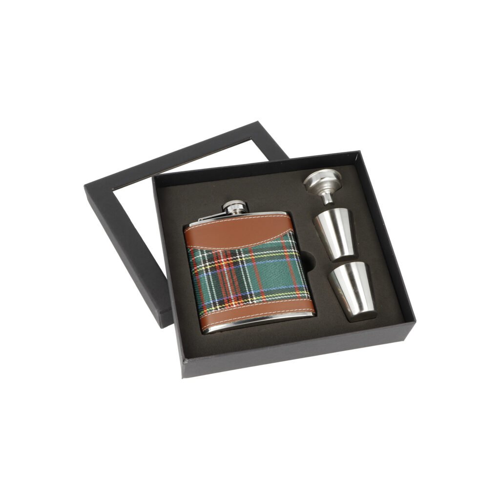 Dárková sada nerezová placatka na alkohol s pohárky a nálevkou Tartan. Likérka je vyrobená z kvalitní nerezové oceli s leštěným povrchem. Placatka je potažená hnědou koženkou a látkou s tartanovým vzorem.