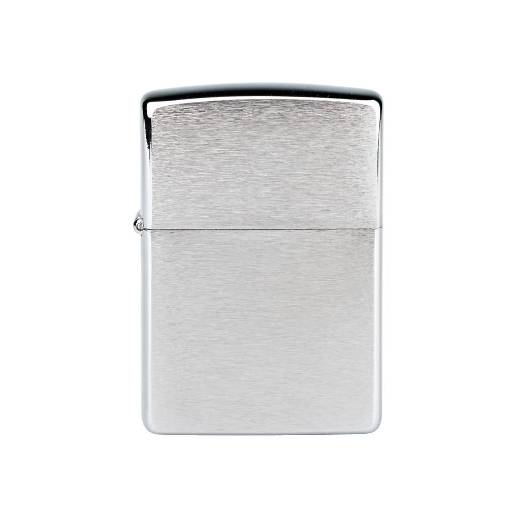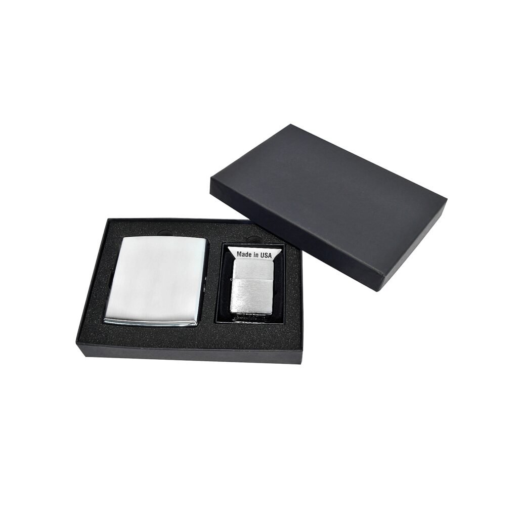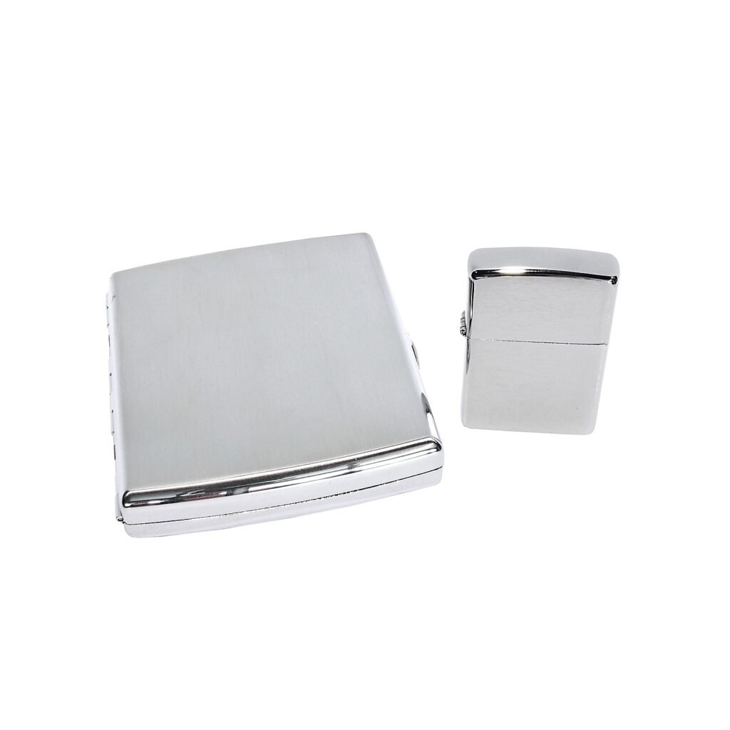 Dárková sada Zippo. Benzínový zapalovač Zippo Brushed Chrome, tabatěrka na 20 ks cigaret klasické velikosti (King Size). Cigaretové pouzdro má přední a zadní stranu stejnou. Cigarety zajištěny plíškem.