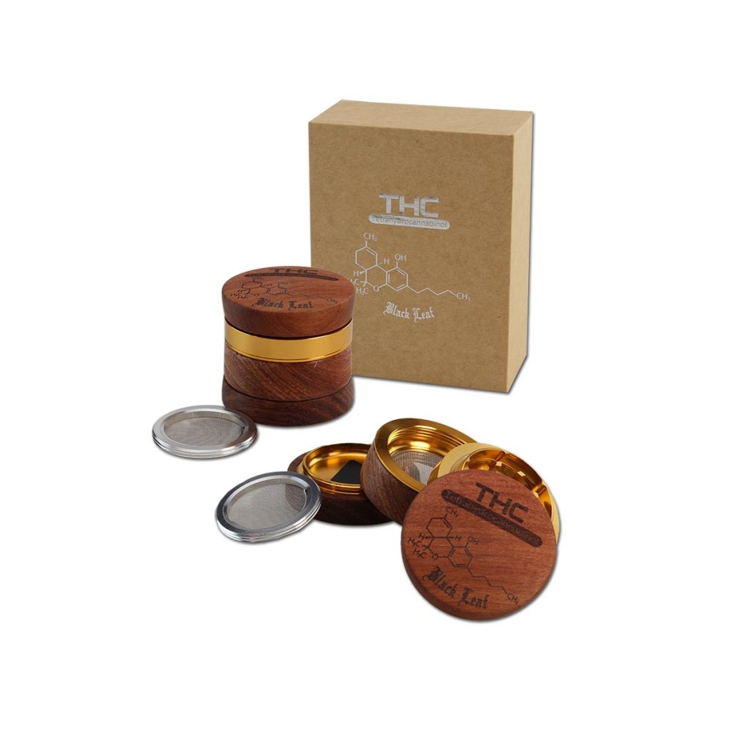 4dílný mlýnek od Black Leaf® je vyroben z vnější strany z ušlechtilého dřeva, které vytváří příjemný pocit při otáčení tam a zpět. Stylový motiv „THC“ poskytuje skvělý vzhled. Vnitřek je vyroben z eloxovaného hliníku, včetně diamantově broušených, silných zubů. Nylonový posuvný kroužek zabraňuje oděru a usnadňuje otáčení.
