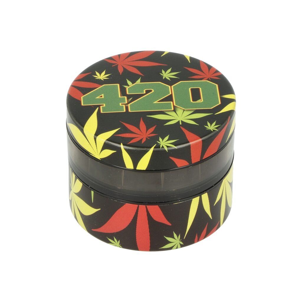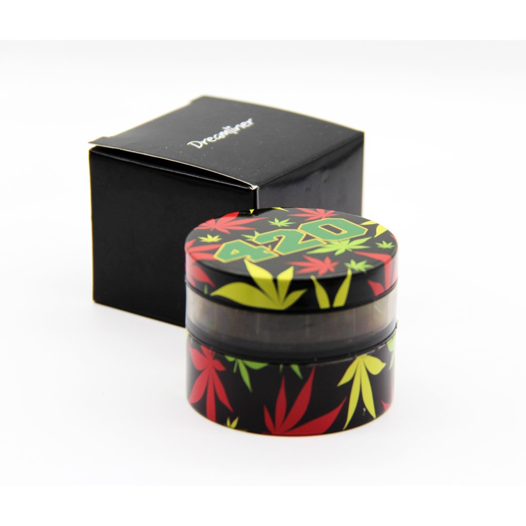 Plastový drtič tabáku a bylin Dreamliner Colored Leaves. Třídílná plastová drtička konopí a jiných bylinek se sítkem a zásobníkem je vyrobena z tvrzeného plastu. Drtič v černé barvě s transparentní drtící částí má povrch v lesklém provedení a celý je zdobený barevnými listy konopí a číslem 420. Jednotlivé díly drtičky na tabák jsou spojené zasunutím do sebe. Víčko a drtící část je spojena na magnet. Plastové ostří ve tvaru obdélníku a jeho ostré hrany nadrtí tabákovou nebo bylinou směs do požadované hrubosti. Drtička je dodávaná v kartonové krabičce.