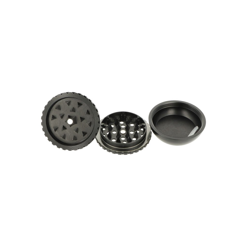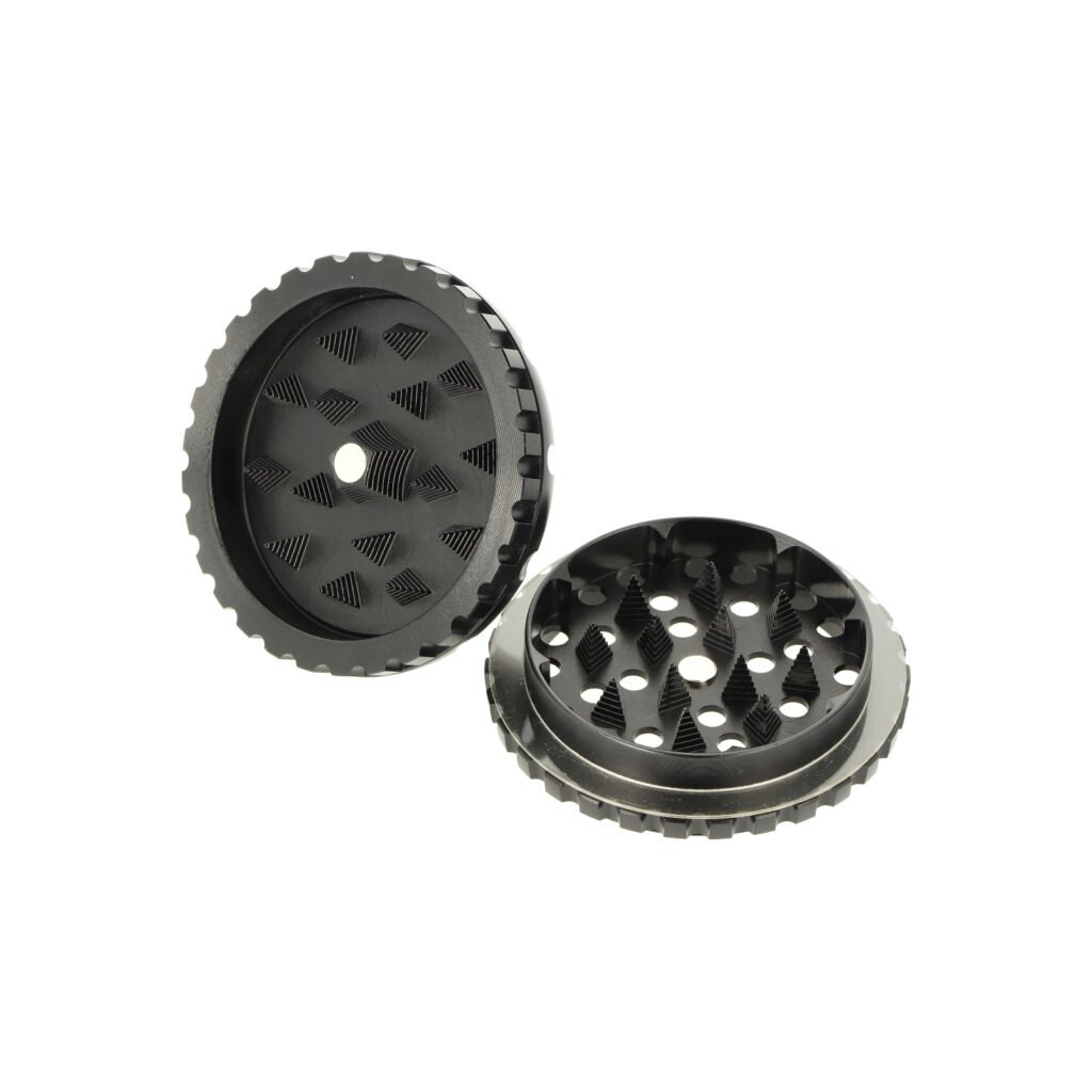 Kovová drtička tabáku a bylin Gyro Chrome na otáčivém podstavci ve tvaru "káči". Třídílný hliníkový drtič konopí a dalších bylinek se závitem, zásobníkem, ale bez sítka je vyroben z eloxovaného hliníku CNC technologií. Drtička v šedo stříbrném metalickém provedení má hladký povrch. Drtící část se zásobníkem je pevně spojená na závit, víčko na magnet. Toto zajišťuje pohodlné používání drtiče a současně pevný spoj. Broušené ostří nožů ve tvaru diamantu velmi jemně nadrtí vaši směs do požadované hrubosti. Drtič je dodávaný v kartonové krabičce.