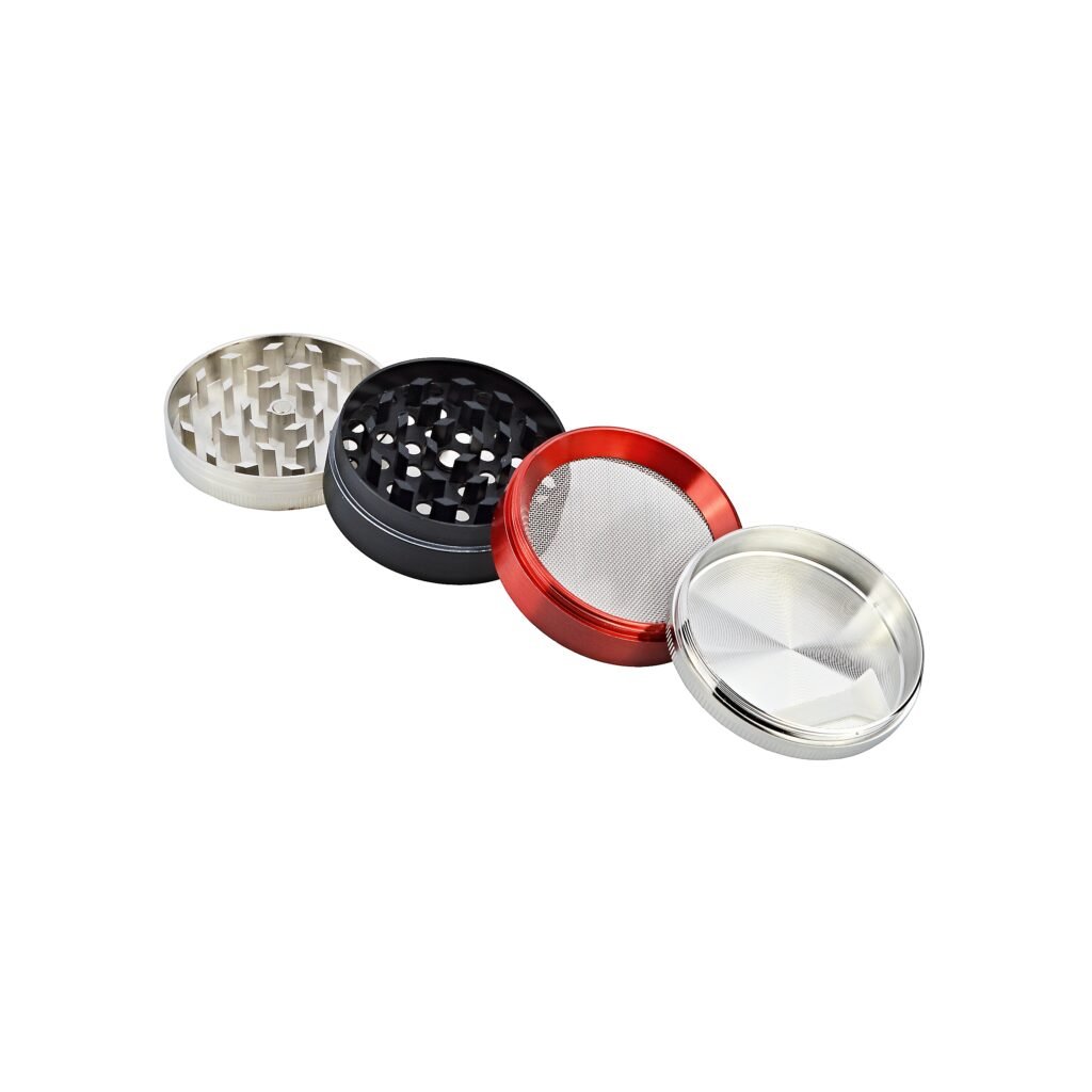 Kovový drtič tabáku a bylin. 4-dílný. Průměr 50mm, Výška 35mm.