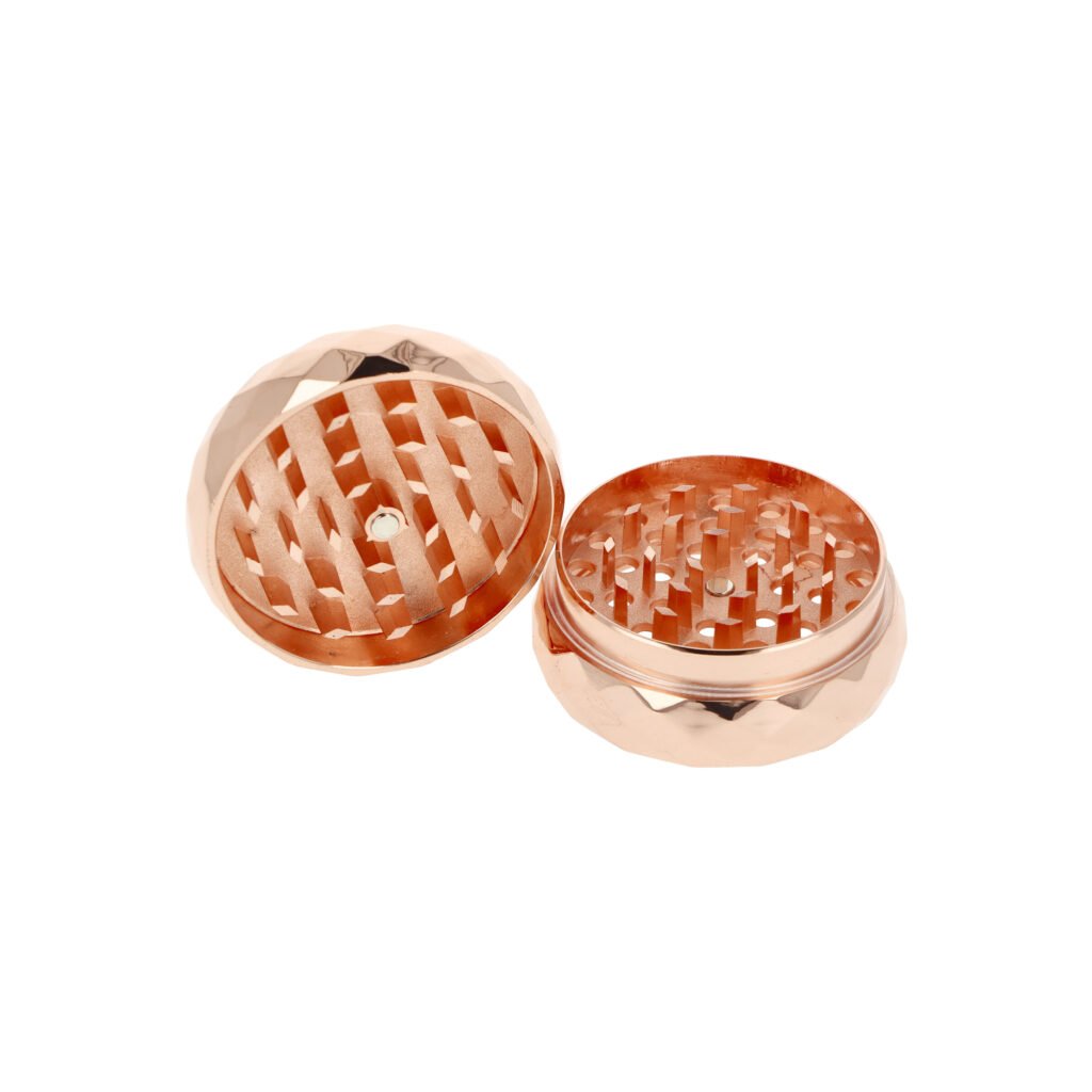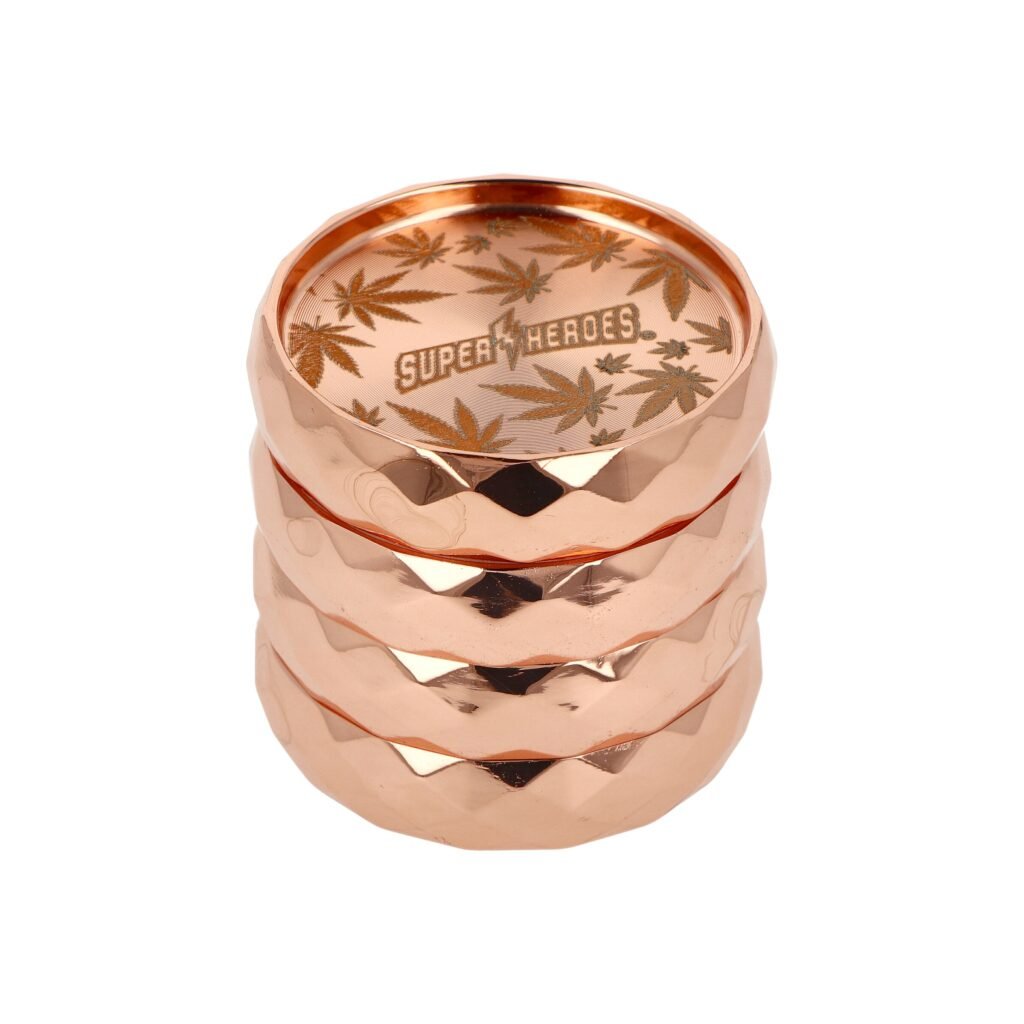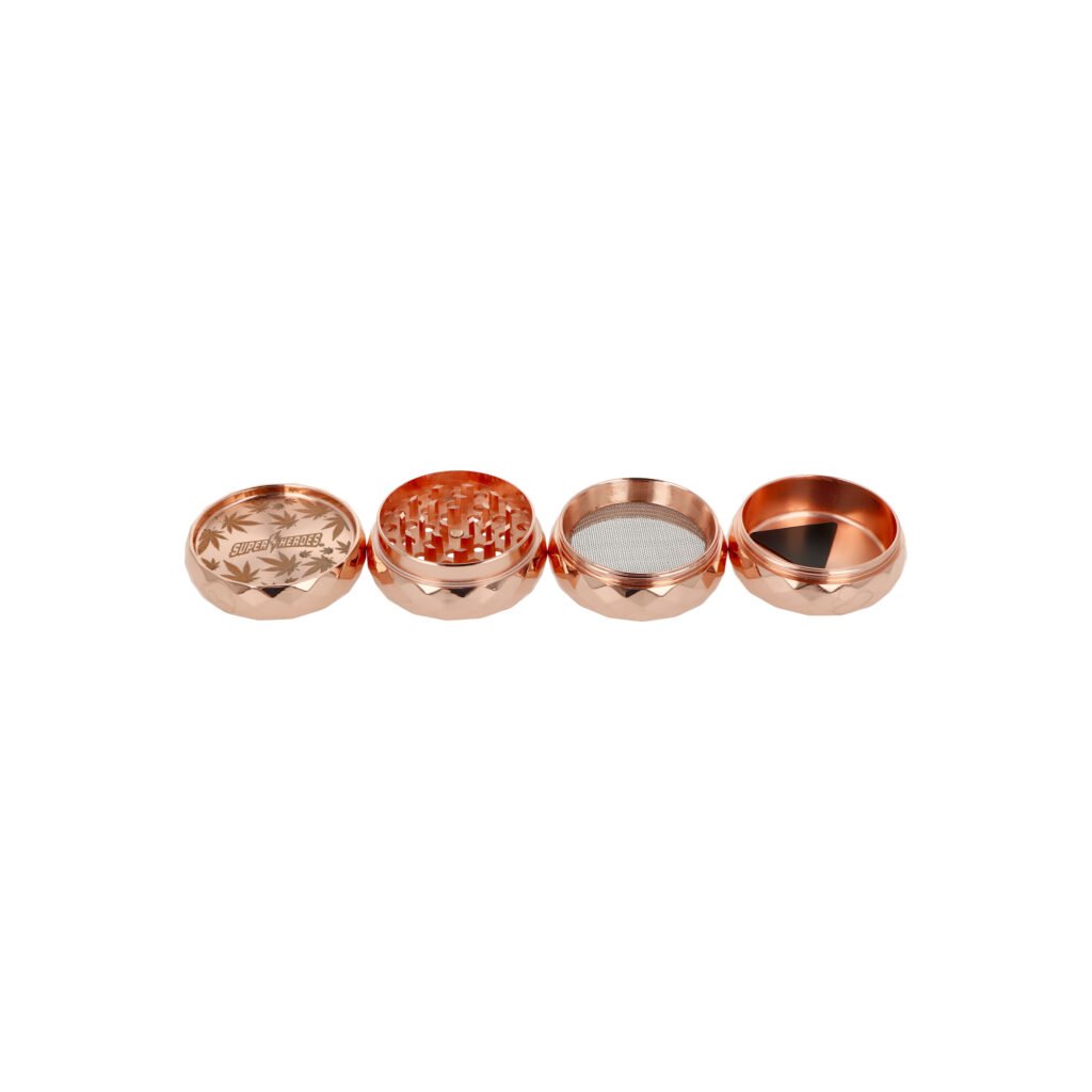 Kvalitní kovový drtič tabáku Super Heroes Copper. Masivní čtyřdílná drtička v měděném lesklém provedení se závitem, sítkem a zásobníkem na tabák. Logem a listy konopí zdobené víčko drtičky je magneticky uzavíratelné. Ostré hroty ve tvaru diamantu nadrtí velmi jemně vaší směs. Drtič je dodávaný v kartonové krabičce.