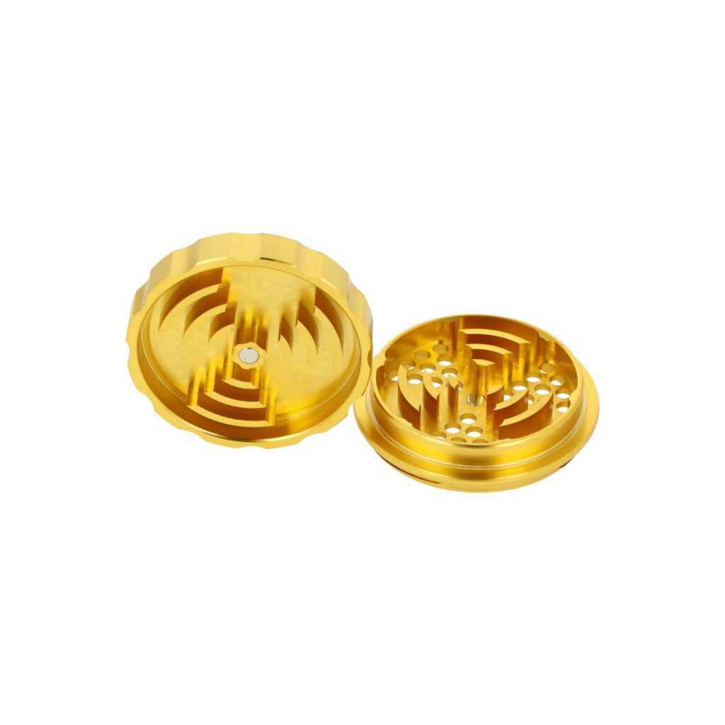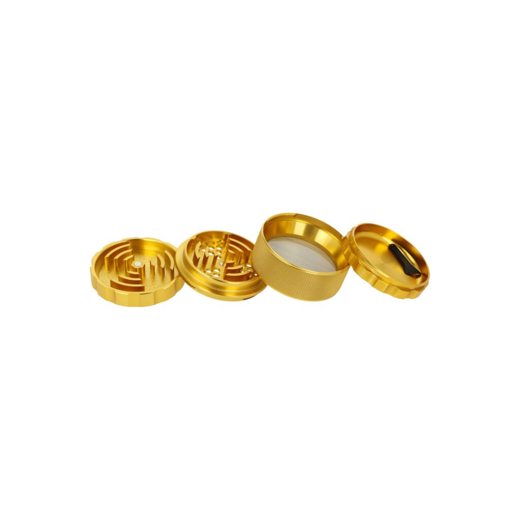 Kovový drtič tabáku a bylin Super Heroes Gold II. Čtyřdílná hliníková drtička konopí a jiných bylinek se závitem, sítkem a zásobníkem je vyrobena z kvalitního hliníku CNC technologií. Drtič v lesklém zlatém provedení má hladký povrch kombinovaný s hrubou plochou v místě uchopení. Drtící část je pevně spojená na závit, víčko na magnet. Broušené ostří nožů velmi jemně nadrtí vaši směs do požadované hrubosti. Drtič je dodávaný v kartonové krabičce.