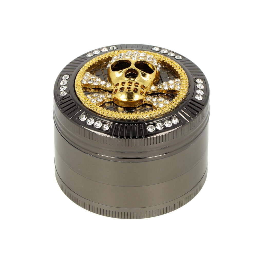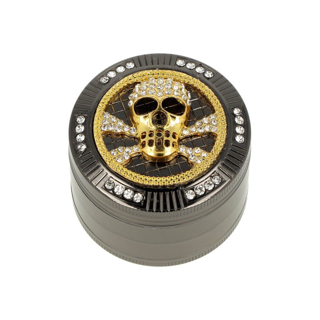 Atraktivní kovová drtička tabáku a bylin Super Heroes Skull. Čtyřdílný hliníkový drtič konopí a dalších bylinek se závitem, sítkem a zásobníkem je vyroben z eloxovaného hliníku CNC technologií. Drtička v gunmetalovém provedení má hladký lesklý povrch. Na víčku najdeme lebku ve zlaté barvě, kterou doplňují broušené kamínky. Drtící část se zásobníkem je pevně spojená na závit, víčko na magnet. Toto zajišťuje pohodlné používání drtiče a současně pevný spoj. Broušené ostří nožů ve tvaru diamantu velmi jemně nadrtí vaši směs do požadované hrubosti. Drtič je dodávaný v kartonové krabičce.