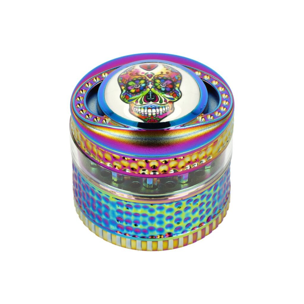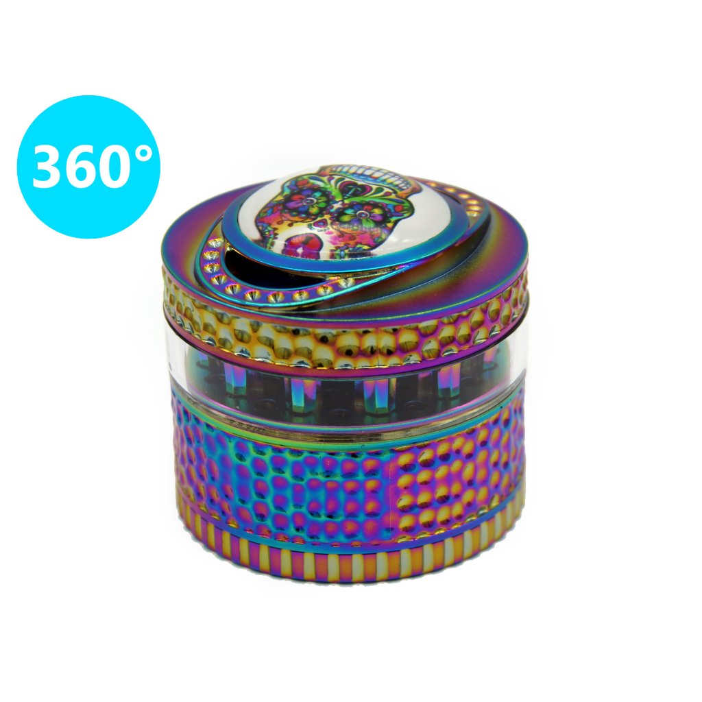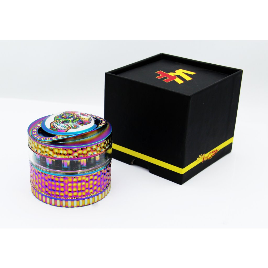 Duhový kovový drtič tabáku a bylin Wildfire Rainbow Skull. Čtyřdílná hliníková drtička konopí a jiných bylinek se závitem, sítkem a zásobníkem je vyrobena z kvalitního hliníku CNC technologií. Bohatě zdobený masivní drtič v duhovém provedení má povrch v kombinaci lesklé a satin úpravy. Víčko s výrazným 3D motivem má uprostřed barevnou lebku zalitou transparentní pryskyřicí do oblého tvaru. Díky průhledné drtící části z tvrzeného plastu můžeme sledovat průběh drcení. Drtící část je pevně spojená na závit, víčko na magnet. Broušené ostří velkých nožů ve tvaru šestihranu velmi jemně nadrtí vaši směs do požadované hrubosti.