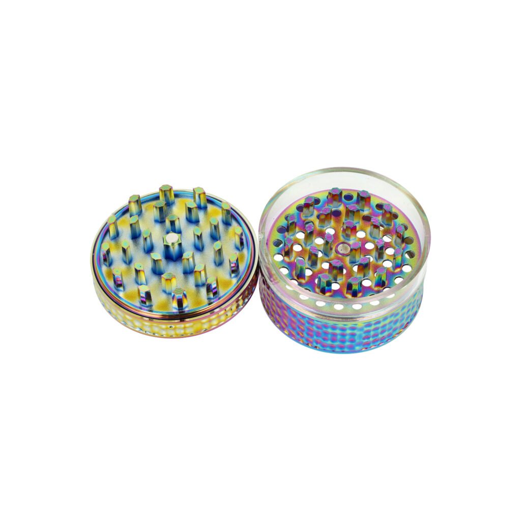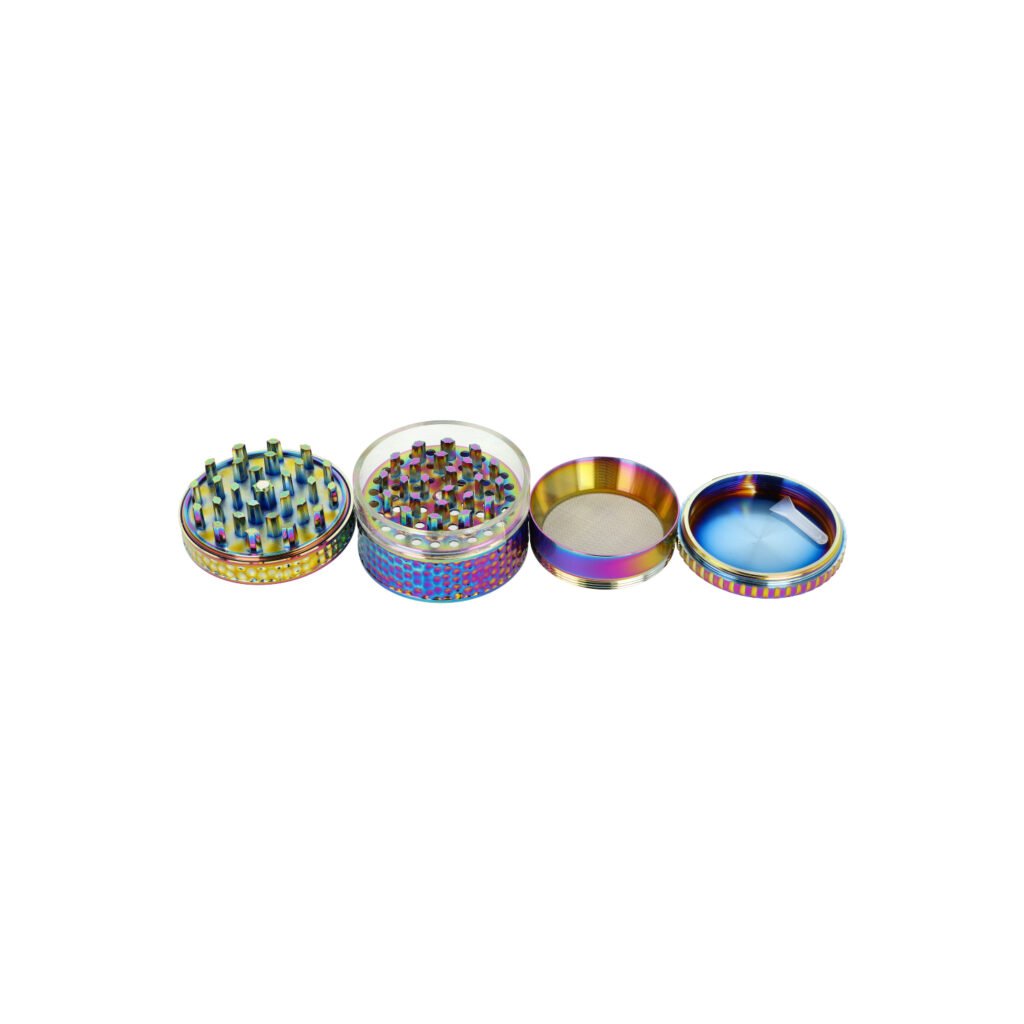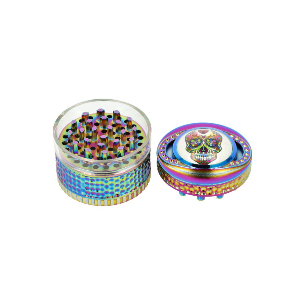 Duhový kovový drtič tabáku a bylin Wildfire Rainbow Skull. Čtyřdílná hliníková drtička konopí a jiných bylinek se závitem, sítkem a zásobníkem je vyrobena z kvalitního hliníku CNC technologií. Bohatě zdobený masivní drtič v duhovém provedení má povrch v kombinaci lesklé a satin úpravy. Víčko s výrazným 3D motivem má uprostřed barevnou lebku zalitou transparentní pryskyřicí do oblého tvaru. Díky průhledné drtící části z tvrzeného plastu můžeme sledovat průběh drcení. Drtící část je pevně spojená na závit, víčko na magnet. Broušené ostří velkých nožů ve tvaru šestihranu velmi jemně nadrtí vaši směs do požadované hrubosti.