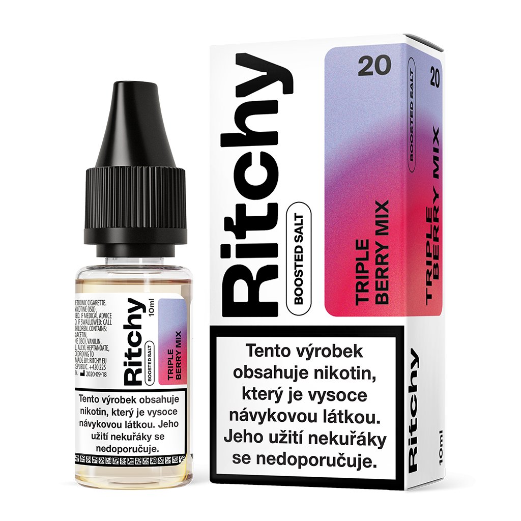 Populární český výrobce Ritchy přichází na trh se svou sérií salt nikotinových e-liquidů s ovocným charakterem. Příjemně osvěžující druhy a bravurně navržené kombinace chutí roztančí vaše chuťové pohárky a snadno si je zamilujete už po pár potazích. Tyto vymazlené ovocné směsi se skvěle hodí nejen pro celodenní vaping, ale také pro chvíle relaxu a příjemného posezení u kávy.