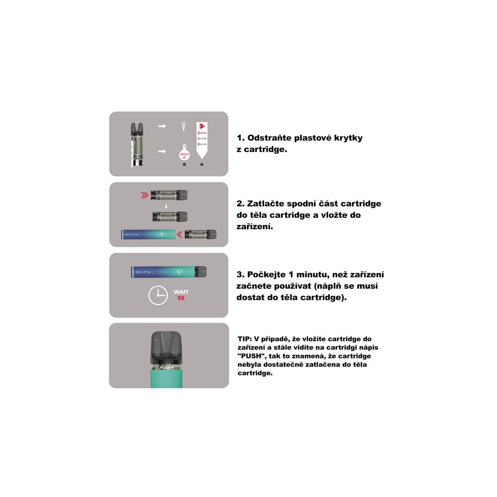 - Počkejte 1 minutu, než zařízení začnete používat (náplň se musí dostat do těla cartridge).
