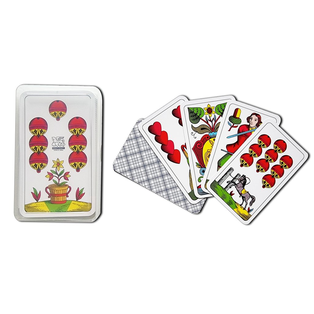 …herní sada zobrazuje na jednotlivých figurách legendu o Vilému Tellovi, obraz karet je s drobnými změnami stejný již 150 let. Obrazy jednotlivých es zobrazují roční období od jara do zimy. Károvaný revers je typický pro tuto hru. Mezi hráči je velmi oblíbený pro svoji praktičnost.