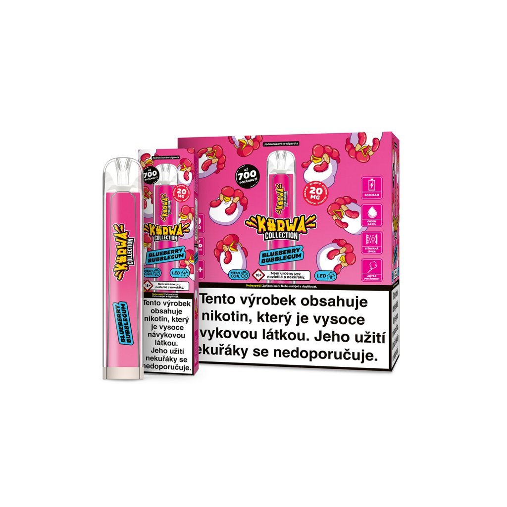 Kurwa Collection přichází na trh hned v několika skvělých chuťových mixech. Příchutě jsou velmi povedené a autentické. Oblibu si získají zejména u uživatelů, kteří preferují sladší chutě náplní. Nikotinová sůl, která se v poslední době těší velké oblibě neškrábe v krku a má velmi rychlou vstřebatelnost. Díky baterii o kapacitě 500 mAh Vám e-cigareta vydrží alespoň na 700 potáhnutí. Objem náplně je 2 ml. Za zmínku stojí určitě také moderní design nebo LED podsvícení. Jednorázová e-cigareta nelze doplňovat ani dobíjet.