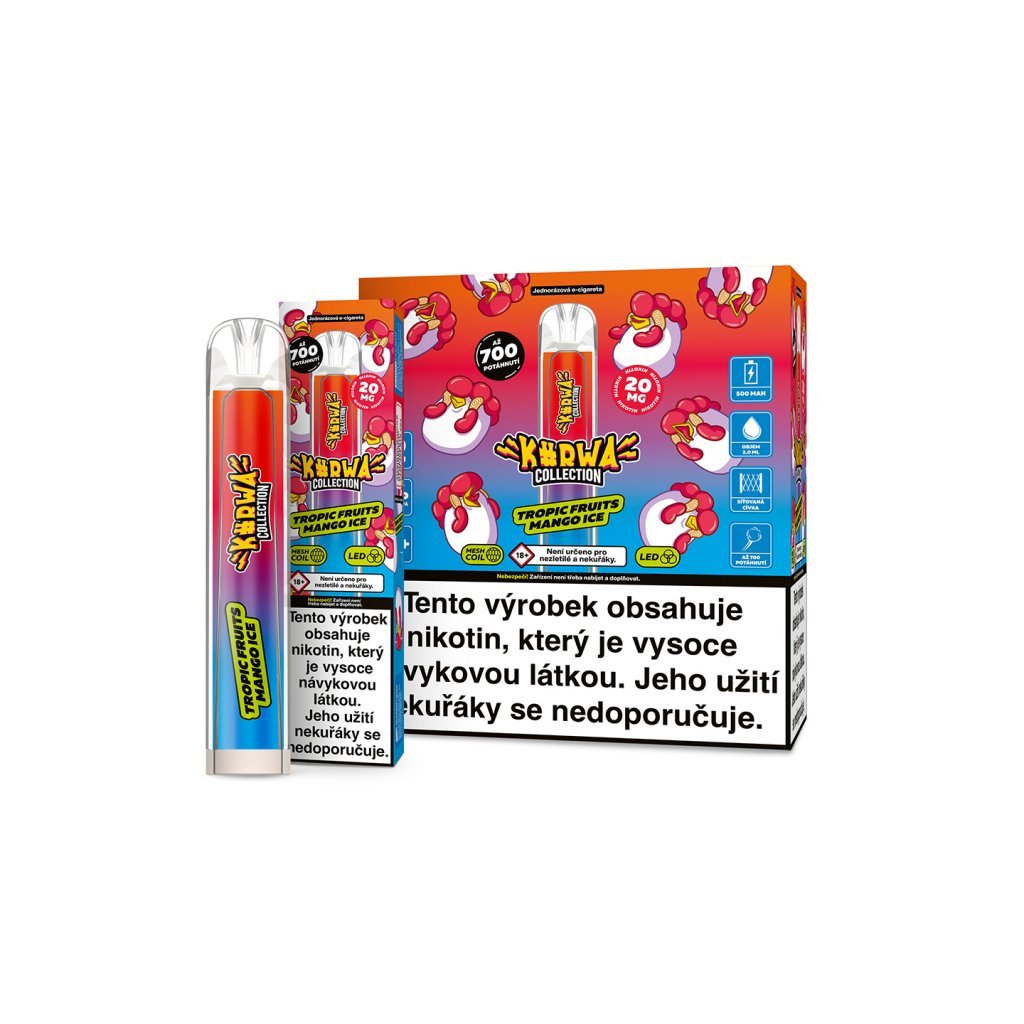 Kurwa Collection přichází na trh hned v několika skvělých chuťových mixech. Příchutě jsou velmi povedené a autentické. Oblibu si získají zejména u uživatelů, kteří preferují sladší chutě náplní. Nikotinová sůl, která se v poslední době těší velké oblibě neškrábe v krku a má velmi rychlou vstřebatelnost. Díky baterii o kapacitě 500 mAh Vám e-cigareta vydrží alespoň na 700 potáhnutí. Objem náplně je 2 ml. Za zmínku stojí určitě také moderní design nebo LED podsvícení. Jednorázová e-cigareta nelze doplňovat ani dobíjet.