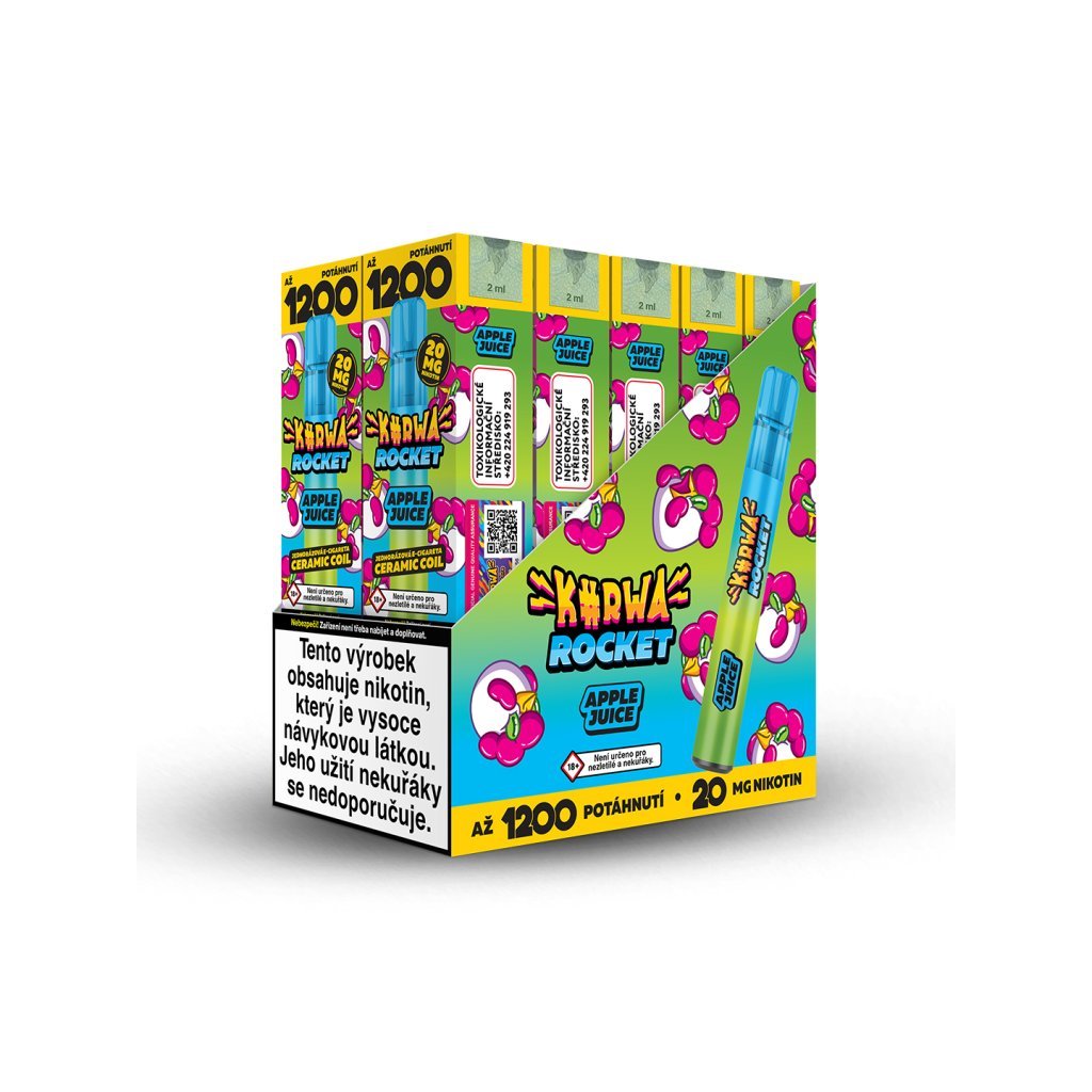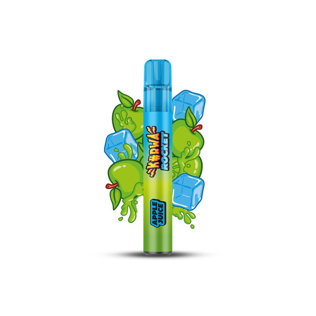 Jednorázová e-cigareta KURWA ROCKET Apple Juice se sladkou a příjemně sladkou chutí džusu ze zelených jablek. Kurwa Rocket je jednorázová e-cigareta s obrovskou výdrží až 1200 potahů. Díky tak velké výdrží disponuje zejména kvůli keramické žhavící cívce a tedy rovnoměrnému a pozvolnému odpařování e-liquidu. Keramická cívka také mnohem lépe přenáší chuť a vytváří hustší páru.