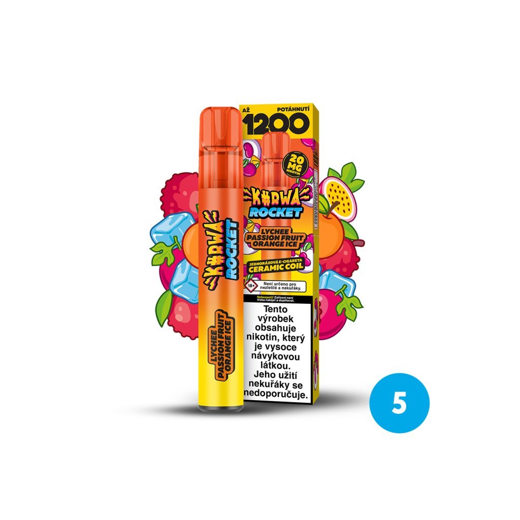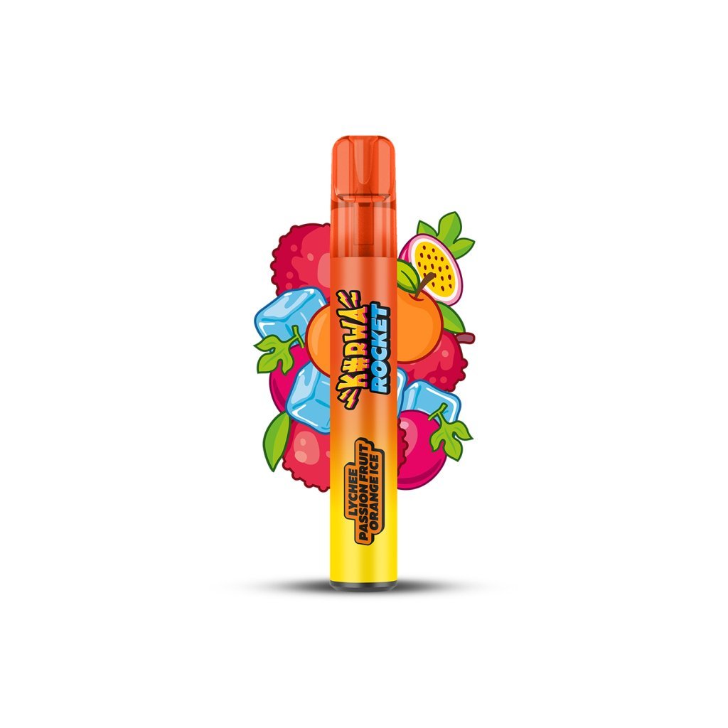 Jednorázová e-cigareta KURWA ROCKET Lychee Passion Fruit Orange Ice s exotickým mixem chutí sladkého liči, šťavnaté maracuji a svěžího pomeranče. Celou chuť poté doplňuje ledová svěžest coolády. Kurwa Rocket je jednorázová e-cigareta s obrovskou výdrží až 1200 potahů. Díky tak velké výdrží disponuje zejména kvůli keramické žhavící cívce a tedy rovnoměrnému a pozvolnému odpařování e-liquidu. Keramická cívka také mnohem lépe přenáší chuť a vytváří hustší páru.