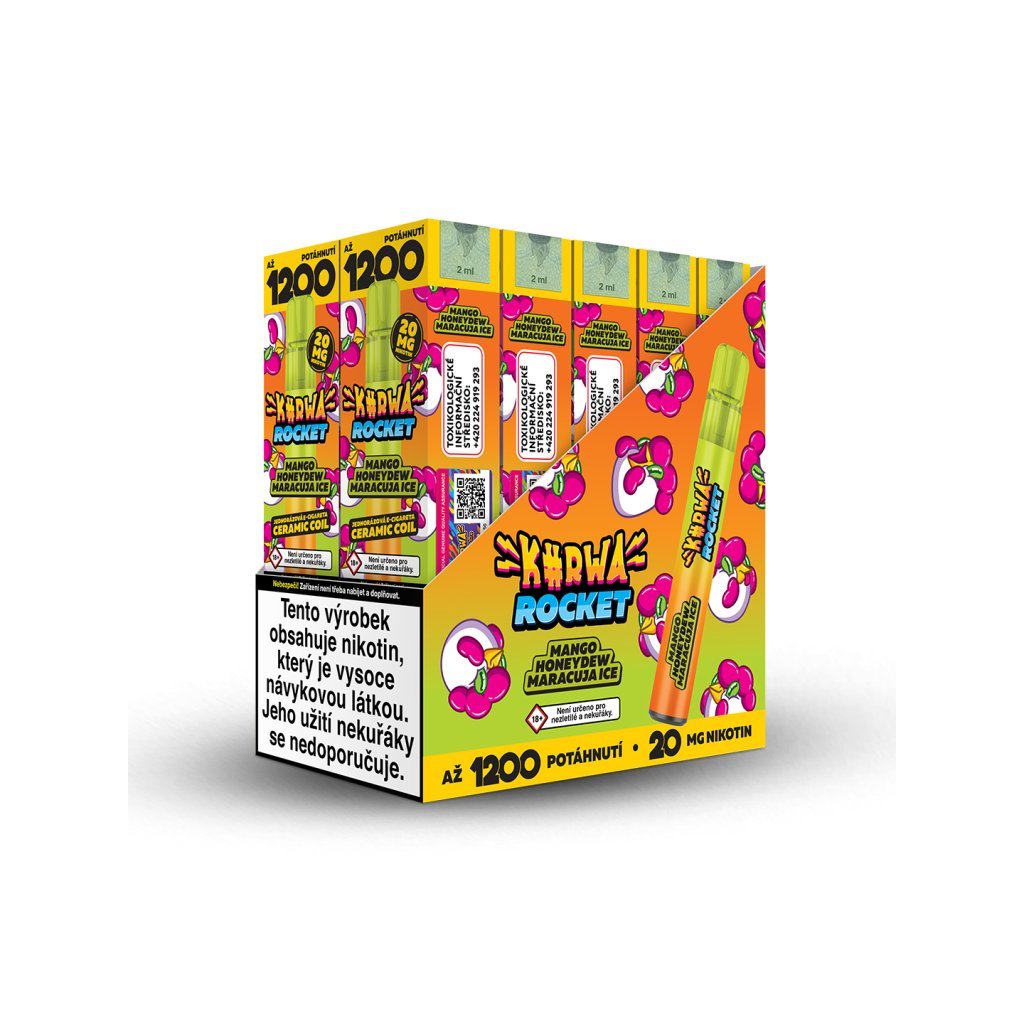 Mango Honeydew Maracuja Ice s oblíbenou tropickou chutí, která spojuje mango, sladký cukrový meloun a šťavnatou maracuju s přidanými ledovými tóny. Kurwa Rocket je jednorázová e-cigareta s obrovskou výdrží až 1200 potahů. Díky tak velké výdrží disponuje zejména kvůli keramické žhavící cívce a tedy rovnoměrnému a pozvolnému odpařování e-liquidu. Keramická cívka také mnohem lépe přenáší chuť a vytváří hustší páru.