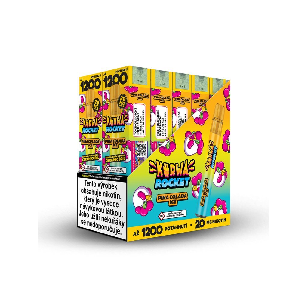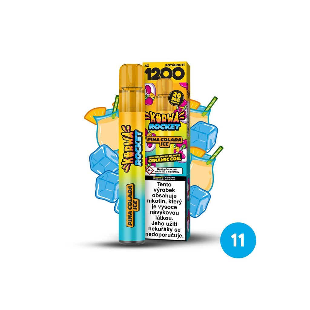 Pina Colada Ice s chutí známého letního drinku, který ukrývá výraznost ananasu, sladkost kokosu a svěžest ledové coolády. Kurwa Rocket je jednorázová e-cigareta s obrovskou výdrží až 1200 potahů. Díky tak velké výdrží disponuje zejména kvůli keramické žhavící cívce a tedy rovnoměrnému a pozvolnému odpařování e-liquidu. Keramická cívka také mnohem lépe přenáší chuť a vytváří hustší páru.