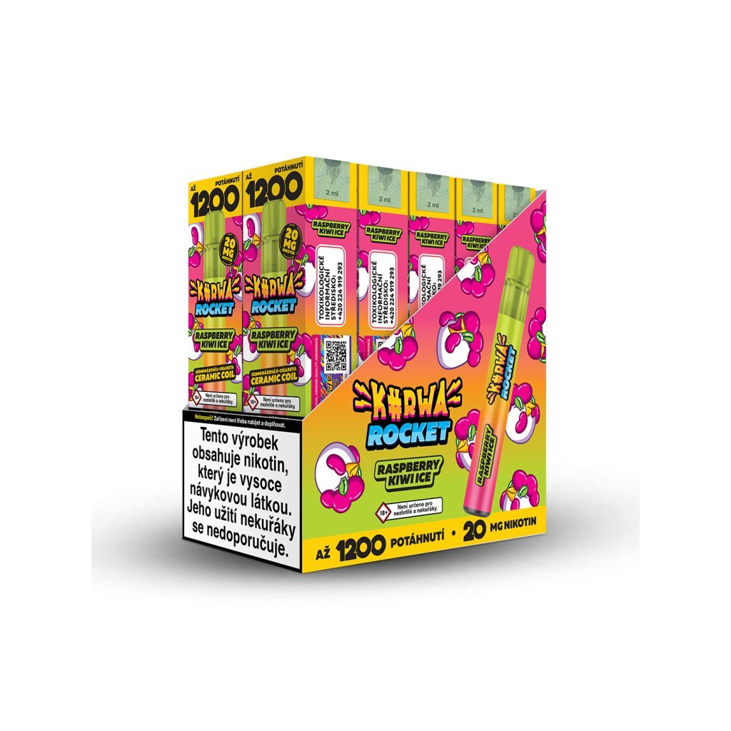 Raspberry Kiwi Ice s chutí, která spojuje sladké maliny s kyselým kiwi a ledovou cooládou. Kurwa Rocket je jednorázová e-cigareta s obrovskou výdrží až 1200 potahů. Díky tak velké výdrží disponuje zejména kvůli keramické žhavící cívce a tedy rovnoměrnému a pozvolnému odpařování e-liquidu. Keramická cívka také mnohem lépe přenáší chuť a vytváří hustší páru.