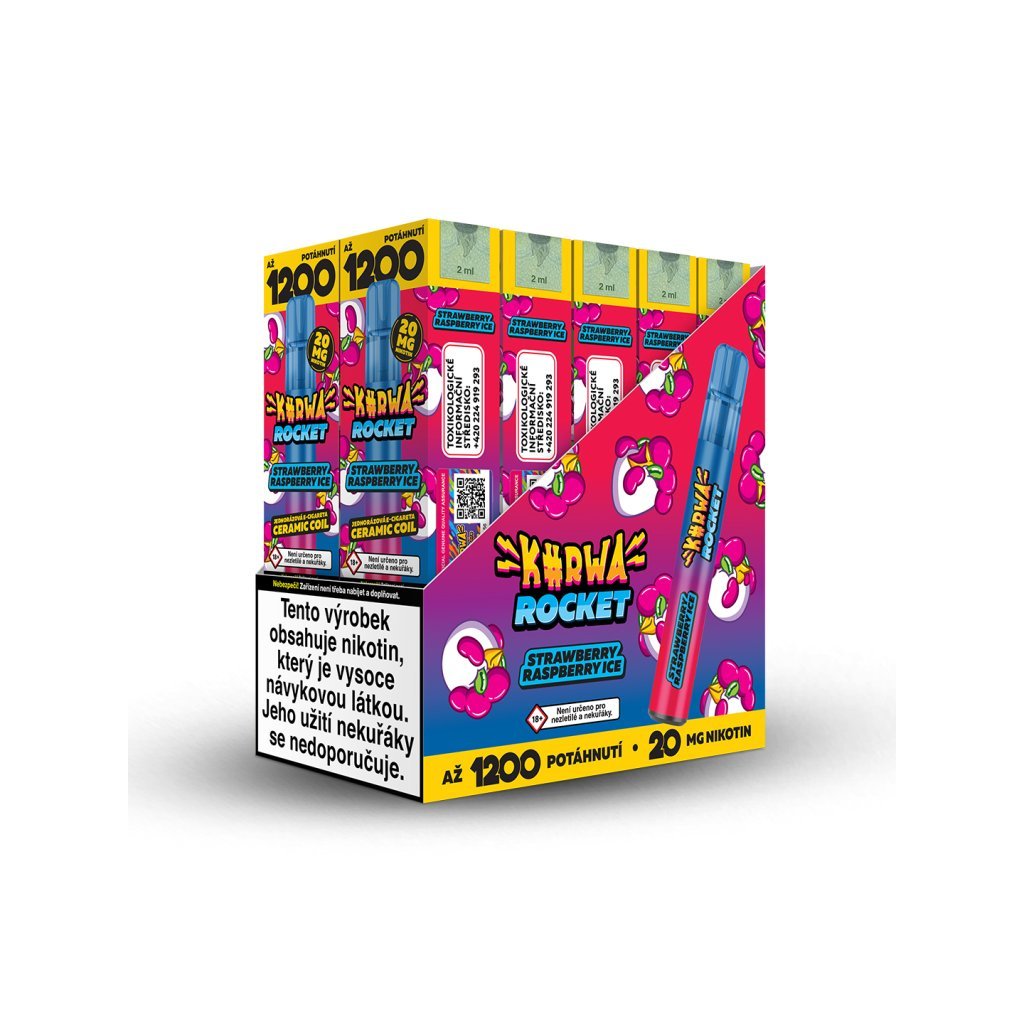 Strawberry Raspberry Ice s chutí sladkých jahod a příjemně kyselých malin, které příjemně doplňují osvěžující tóny coolády. Kurwa Rocket je jednorázová e-cigareta s obrovskou výdrží až 1200 potahů. Díky tak velké výdrží disponuje zejména kvůli keramické žhavící cívce a tedy rovnoměrnému a pozvolnému odpařování e-liquidu. Keramická cívka také mnohem lépe přenáší chuť a vytváří hustší páru.