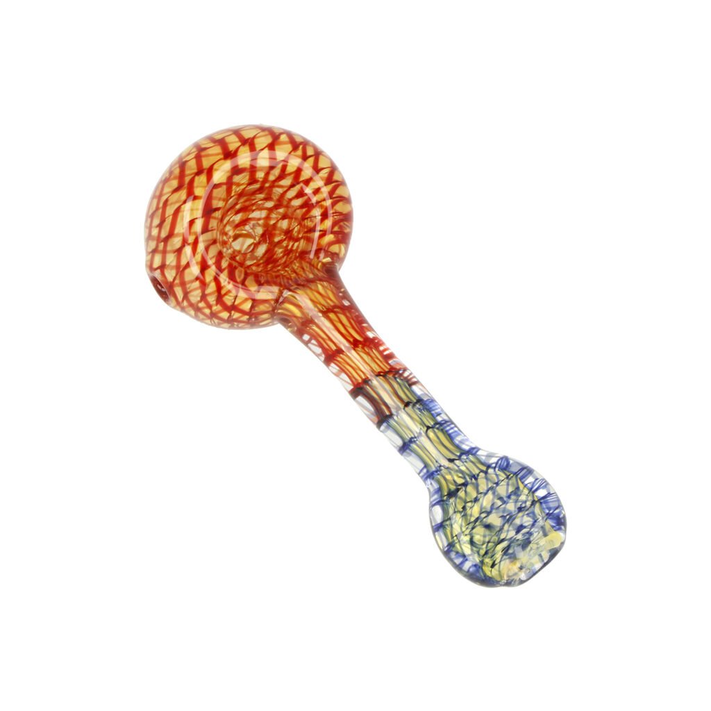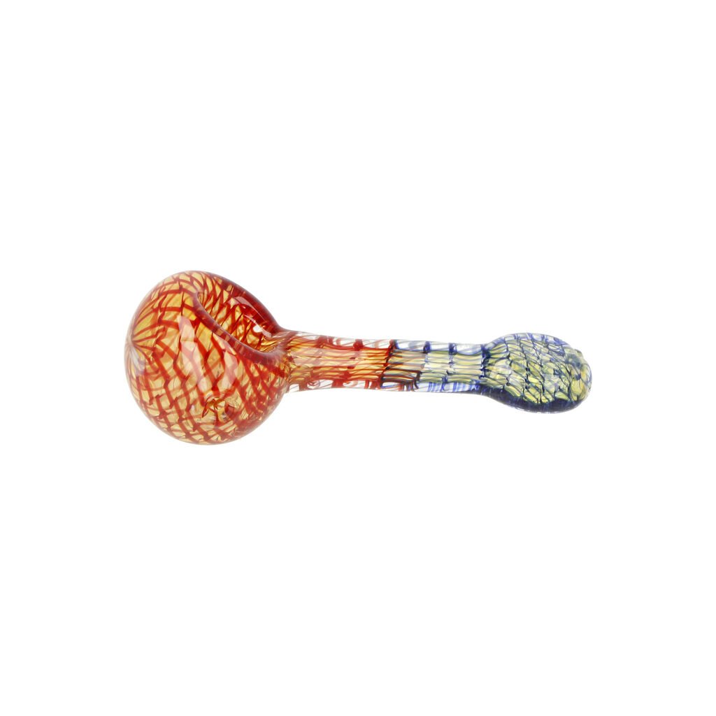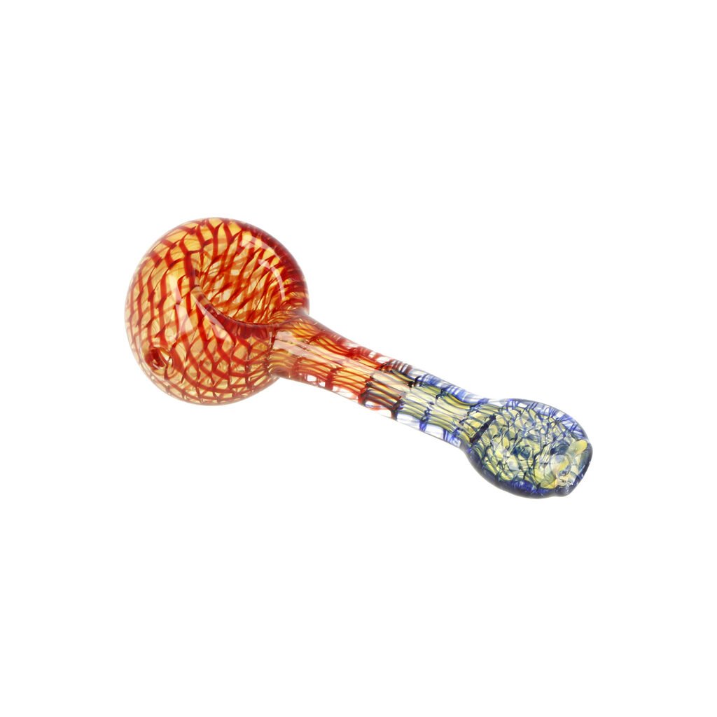 Skleněná šlukovka Pyrex Síť s turbem. Menší odolná skleněná dýmka v modro oranžovém tónu je zdobená síťovaným vzorem.