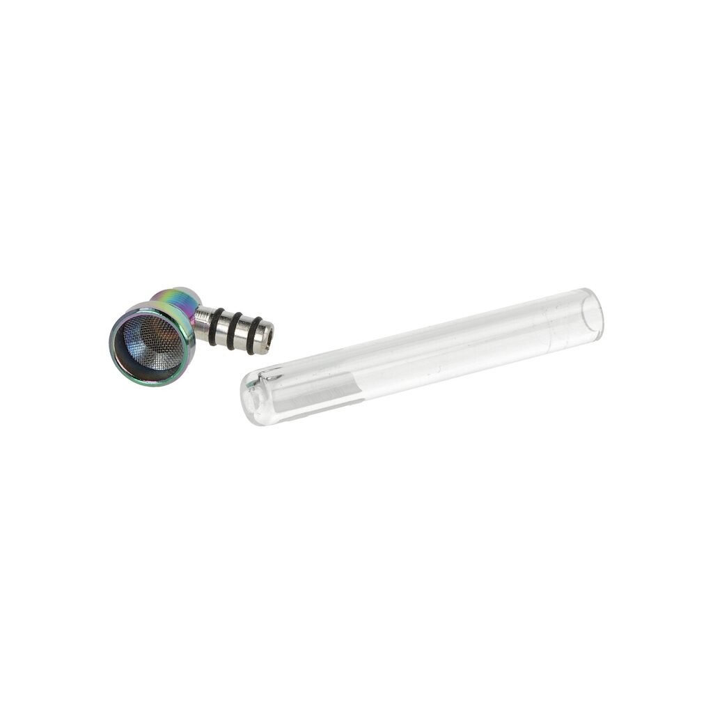Transparentní skleněná šlukovka Super Heroes s kovovým kotlem a sítkem. Rovná silnostěnná skleněná dýmka je vyrobená z kvalitního borosilikátového tloušťky 2 mm. Kovový kotlík se sítkem má povrch v rainbow provedení. Pro snadné čistění lze kotlík ze šlukovky vyjmout. Díky plochému dnu kotle můžeme šlukovku opřít a zabránit jejímu poškození. Cena je uvedená za 1 ks.